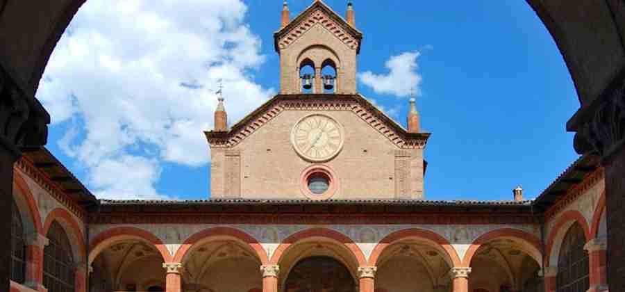 Il palazzo ha un pregevole portale del 1525, opera di Andrea da Formigine. Nel portico era presente un affresco di Annibale Carracci in pessime condizioni di conservazione. Vi sono inoltre due affreschi di Bartolomeo Ramenghi (detto anche Bartolomeo da Bagnacavallo) mentre quello di Camillo Procaccini, contenuto nell'abside della cappella di san Clemente fu distrutto nel 1914. Nella cappella è presente un pregevole polittico di Marco Zoppo. Si segnalano anche affreschi trecenteschi della scuola di Vitale da Bologna e di Andrea di Bartolo.