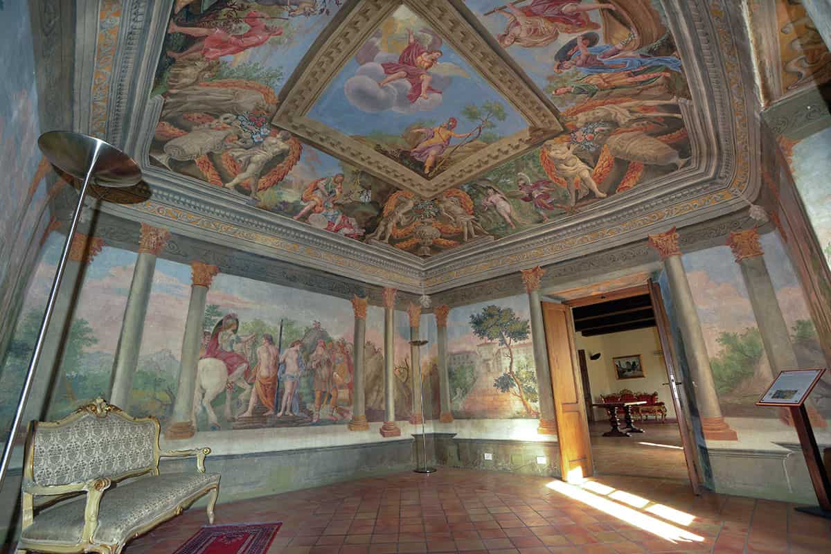 All'interno si devono segnalare la presenza di numerose sale affrescate di notevole interesse e bellezza; nel torrione sud troviamo la sala Gerusalemme liberata con copertura a volta interamente affrescata tratte dal poema tassiano; al primo piano di grande effetto è la decorazione del Salone delle Prospettive  che reca la data 1645, con vedute prospettiche di paesaggi, incorniciate da un colonnato scandite dalle figure monocrome di Vulcano Ganimede, Giove e Marte, Ercole e Mercurio, Nettuno e Apollo; nei medaglioni monocromi, sopra le belle porte in legno dipinte, si riconoscono le figure allegoriche delle arti (pittura e scultura); di pregevole fattura è il soffitto a cassettone e travi con rosette a rilievo in nero e oro; il pavimento in ceramica è stato ripristinato dai marchesi Theodoli in epoca più recente; ancora affrescate sono una sala da bagno il cui soffitto ospita al centro la scena di Mosè e il miracolo dell'acqua ed in fine la sala dei ciclopi che prende il nome dalle figure agli angoli del soffitto, in atto di sostenere medaglioni con le figure monocrome di Apollo, Marte, ed Ercole. Autore degli affreschi fu Giovan Angelo Canini studioso di antichità classiche e pitture, allievo per un breve periodo del Domenichino, che "prese poi servitù dal cardinal Astalli e per mezzo di lui la prese ancora col marchese suo fratello, che lo condusse a dipingere nel palazzo e chiese del feudo di Sambuci".