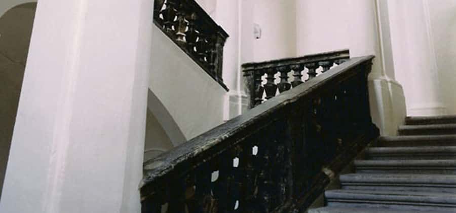 Ristrutturata nel 1998, la bellissima costruzione barocca è oggi completamente isolata e difficilmente individuabile nell’antica piazzetta che è stata del tutto modificata nel suo assetto originario. Di forma rettangolare, lo scalone è articolato su tre piani e si sviluppa attorno al vuoto centrale con un suggestivo effetto scenografico di forte verticalità. Fra i particolari più interessanti, si segnalano i decori in stucco, l’uso di materiali in contrasto, la balaustra in marmo della scala.