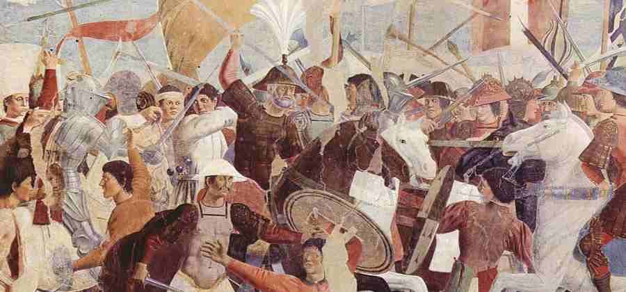 Piero si discostò comunque dai modelli precedenti, a livello di scelta delle storie (alcune sono trattate individualmente, come quella del Sollevamento della Croce), sia a livello iconografico (Adorazione della Croce e incontro di Salomone e la Regina di Saba, Sogno di Costantino, Battaglia di Costantino e Massenzio). Egli inoltre non si curò dell'andamento cronologico, privilegiando un criterio meramente estetico-formale, che creasse effetti di simmetria, senza per questo impedire rispondenze filosofico-teologiche tra scene che si fronteggiano. In alto ad esempio, sia nella parete sinistra che in quella di destra è rappresentata una scena all'aperto, mentre nel registro mediano si trovano due scene di corte su sfondo architettonico, e, in basso, due battaglie. A determinate scene dell'Antico Testamento inoltre si contrappongono altre del Nuovo.