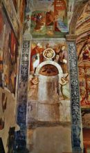 La chiesa è ad unica navata, parte della quale, assieme al coro e all'arco trionfale, è coperta da tre cicli di affreschi: i primi due sono stati realizzati da Vitale da Bologna verso la fine del Trecento, mentre il terzo fu splendidamente affrescato da Martino da Udine, detto Pellegrino da San Daniele, il quale vi lavorò in diverse fasi dal 1497 al 1522. Nella volta del coro sono raffigurati Profeti ed Evangelisti, nella parete di fondo una Crocifissione, mentre nei sottarchi ancora figure di Profeti. Lungo le pareti del coro, nell'arco trionfale e a sinistra sono rappresentate le Storie di Sant'Antonio abate e di Cristo, ove sono presenti ancora tracce del ciclo più antico con scene dell'Infanzia di Cristo.