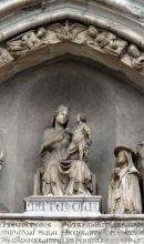 La facciata presenta una struttura a salienti, con tre portali gotici e tre cuspidi, ornate da sculture in marmo, in corrispondenza di ognuna delle tre navate; in quella centrale, entro un rosone cieco, si trova la statua del Cristo Benedicente. Nel progetto di Alvino fu previsto dunque l'inserimento di opere risalenti ai lavori di rifacimento di inizio Quattrocento, infatti il portale centrale, sostenuto da leoni stilofori consumati dal tempo di Tino di Camaino, così come i due portali laterali, in stile gotico internazionale, sono pressoché originali ed eseguiti su committenza del cardinale Enrico Minutolo, appartengono allo scultore Antonio Baboccio da Piperno, che eseguì nella lunetta centrale anche le sculture dei Santi Pietro e Gennaro ed il Cardinale Minutolo adorante, ai lati della Madonna col Bambino ancora del Camaino.