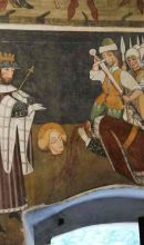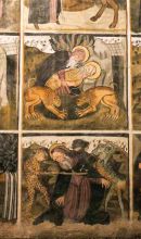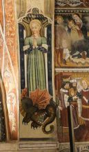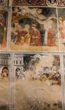I grandi riquadri occupano tutti gli spazi delle pareti, come in una sacra rappresentazione medioevale. Negli episodi della Vita di san Fiorenzo il santo è raffigurato come un martire della Legione Tebea ed evangelizzatore. Nel Paradiso, o Gerusalemme celeste, accanto alla Vergine incoronata vengono accolte le anime di quanti compiono sulla terra le prescritte sette opere di misericordia e perseguono la strada della virtù. L'Inferno è raffigurato in modo realistico, con la serie dei vizi inghiottita dalla bocca del drago infernale. Dodici riquadri mostrano scene della Vita di sant'Antonio abate. Nell'ultimo riquadro è presente la scritta in caratteri gotici: "MCCCCLXXII die XXIII MENSIS iunii hoc opus fecit fieri facius turrinus".