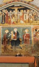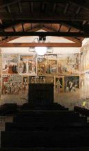 Sulla controfacciata sono raffigurati episodi dell'Infanzia di Gesù, prendendo spunto anche dai vangeli apocrifi; sulla parete laterale sinistra, in ventidue riquadri appare la Passione, morte e resurrezione di Gesù Cristo, la cui immagine è il punto di riferimento determinante di tutta la narrazione; sulla parete dell'altare situata nel presbiterio, spicca la Crocefissione, con sottostanti figure di Santi e affreschi risalente ai primi del Trecento: sulla parete destra è raffigurato San Giorgio che uccide il drago, sulla volta il Cristo benedicente e i quattro evangelisti ; dalla parete sinistra si accede ad una cappella laterale in stile barocco dove si presuppone siano conservate le spoglie di San Fiorenzo, come testimonia un'antica lapide che recita: "D.o.m hac iacent in hara osa d.flor m.ex leg. teb".