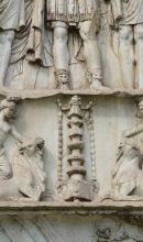 Il fregio figurato della trabeazione sorretta dalle colonne raffigura la processione del trionfo di Traiano sulla Dacia, come di consueto realizzato ad altissimo rilievo.
