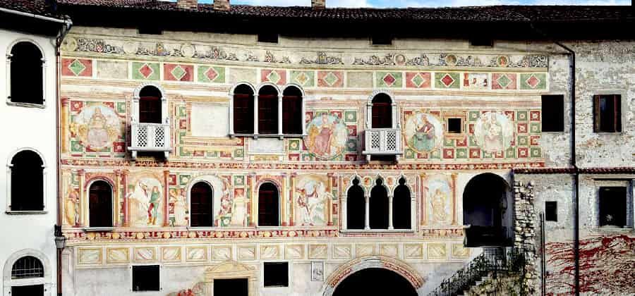 Il castello di Spilimbergo, risalente nelle sue strutture originarie al X/XI secolo, si presenta oggi come un agglomerato di residenze signorili disposte ad anello attorno all’ampia corte centrale ed è circondato per buona parte da un profondo fossato interrato in epoca imprecisata. Tra i diversi corpi di fabbrica che lo compongono quello più noto è costituito dal cosiddetto “palazzo dipinto”, che prende il nome dagli affreschi realizzati nell’ultimo quarto del XV dal pittore sanvitese Andrea Bellunello, mentre l’adiacente “palatium vetus”, incendiato nel corso della rivolta popolare del 1511, non fu più ricostruito.
