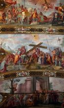 Gli affreschi delle volte della navata e del transetto sono opera di Giovanni Andrea Carlone e Giovanni Battista Carlone e furono realizzati nel 1631. Essi raffigurano: sulla volta della navata, La Croce appare a Costantino, La Prova della vera Croce, Eraclio riporta la Croce a Gerusalemme; sulla volta del transetto, spazi intermedi, affreschi: Trionfo della Croce, Il Serpente di bronzo, Sacrificio di Isacco, Progenitori nel Paradiso terrestre, Passaggio del Mar Rosso (in collaborazione col fratello minore Giovanni Battista Carlone).