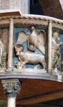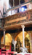 L'interno in mattoni rossi, suggestivo nella sua semplice austerità, conserva varie opere d'arte. Tra navata centrale e cripta è posto il pontile decorato dei Campionesi. Il pulpito centrale di Enrico da Campione (1322) è ornato di statuine in terracotta opera di plastici modenesi aggiunte nei secoli successivi. Pende sopra il pontile un notevole crocifisso ligneo dorato del XIII secolo.