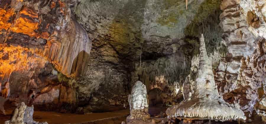 Al centro del salone una colonna di colore giallognolo si leva dal pavimento per accordarsi elegantemente alla volta, formando una sorta di splendido pilastro, la volta è invece completamente addobbata da una miriade di appuntite stalagmiti. Sulla destra della sala si staglia un bellissimo paesaggio denominato il presepe, mentre sulla sinistra si apre un grande ramo parallelo adornato da una stalagmite a forma di tempio orientale detta “La Pagoda”, simbolo turistico delle grotte. Il ramo conduce in un ricchissimo salone che si affaccia sulla galleria principale da un’altezza di una decina di metri.
