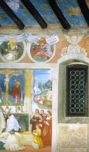 Nel sottostante emiciclo è raffigurata la Famiglia di Battista Suardi. La decorazione del soffitto e delle pareti, staccata dal pavimento a circa 1,60 m di altezza con una finta cornice lignea da spalliere, si deve a Lorenzo Lotto, ed è firmata e datata 1524 nella dedicatoria sulla parete sinistra. Durante i lavori l'artista ebbe come "discepolo" il bergamasco Francesco Bonetti (documentato dal 1517 al 1550).