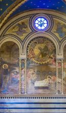 Nell'intervento ricostruttivo, l'antico altare e la venerata immagine della Madonna, strappata dal supporto originario, vengono riposizionati sul lato nord dell'edificio, in modo da consentire l'apertura di ampie finestre sul lato sud, esposto alla luce. Intorno all'immagine sacra viene creato un recinto in ferro, protetto da una balconata con inserti marmorei e colonnine tortili, che realizzava una distinzione fra gli spazi percorsi dai fedeli e la zona riservata all'officiante. Il santuario assume una preziosissima decorazione neogotica, con marmi, terrecotte e affreschi realizzati appositamente. La decorazione marmorea viene commissionata al lapicida rezzatese Davide Lombardi, che riproduce nei plinti delle colonne alcuni simboli mariani. La stuccatura delle lesene e delle innumerevoli cornici viene affidata invece alla famiglia Pedruzzi di Bergamo. La decorazione dipinta, realizzata con la tecnica della tempera a encausto, viene eseguita da Modesto Faustini, al quale si devono l'Annunciazione e la Visitazione ai lati dell'altare e le figure di Cristo, della Madonna e dei Santi nei medaglioni presenti nelle lunette e sugli archi. Alla morte dell'autore i lavori vengono portati a termine da Cesare Bertolotti, che realizza la Crocifissione di Cristo, la Nascita, lo Sposalizio e l'Assunzione della Vergine nei trittici a lato dell'altare e Personaggi dell'Antico Testamento nelle lesene circostanti. Il soffitto del presbiterio, con sfondo blu rivestito di stelle dorate, è opera dei pittori Salvi, Franchini e Chimeri.