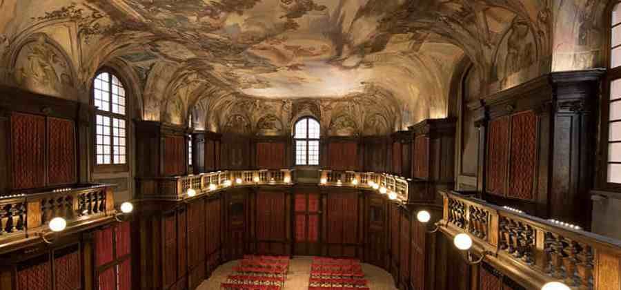 Lungo il perimetro della sala stanno i pregevoli scaffali barocchi in ebano e radica, opere dei frati Andrea da Volta Mantovana, Bernardo da Brescia e Antonio da Sambruson. La biblioteca venne depredata durante l'occupazione napoleonica. Il patrimonio fu smembrato, in parte finì a Parigi, altro confluì nella raccolta universitaria. Molto finì all'asta. La struttura è ora parte occupata dalla scuola media "Giovanni Pascoli" e dalla superiore "Duca d'Aosta" che la utilizzò come aula magna sino al 1995 quando fu colpita da un fulmine che provocò un furioso incendio. Ripristinata nel 2011 è ora utilizzata a scopi culturali.