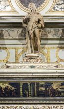 A distanza di pochi mesi dall’apertura del cantiere, nel marzo del 1490, la cappella laterale sinistra del presbiterio doveva già essere conclusa e pronta per accogliere la reliquia del corpo di san Rocco che venne traslata dalla chiesa di San Silvestro. La reliquia rimarrà sistemata nell’altare dedicato successivamente al SS Sacramento fino al marzo 1520, quando, con una solenne processione, venne sistemato in un altare provvisorio cui era stato destinato fin dal 1493. Il concorso per la costruzione dell’altare maggiore venne vinto nel 1517 dallo scalpellino bergamasco Venturino Fantoni, che concepì un innovativo modello di “altare-reliquiario” basato sullo schema, sviluppato a Venezia soprattutto dagli scultori-architetti Pietro e Tullio Lombardo, del monumento funerario a forma di arco trionfale. L’altare-reliquiario è il punto focale di una complessa scenografia, incentrata sul culto del santo, che interessa tutta la cappella con gli affreschi della cupola e dell’abside (iniziati nel 1528) e i teleri sulle pareti affidati a Jacopo Tintoretto nel 1549.
