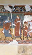 Degli antichi affreschi che narravano le storie di Cristo e che decoravano tutta la controfacciata sinistra, rimane oggi solo la sezione superiore. Un tempo le pareti della chiesa erano letteralmente coperte da affreschi, che furono però tutti coperti da calce (tranne quelli del coro) nel 1656 a causa della peste per evitare il contagio. Gli affreschi furono poi scoperti, frammentari, tra Ottocento e Novecento. Le storie di Cristo furono scoperti nel 1905. I vari pannelli rimanenti raffigurano scene della vita di Gesù separate ognuno dalla figura di uno o più santi. L'opera è datata 1340 e l'autore appone il suo nome ed è Luca d'Atri, ormai considerato la personalità che si cela dietro quella del misterioso pittore del Maestro di Offida, un artista che operò a lungo tra Marche, Abruzzo e Basilicata. La matrice degli affreschi è giottesca, ed è probabile un apprendistato presso Giotto (a cui Luca viene paragonato dai contemporanei) o più probabilmente da Simone Martini a Napoli.