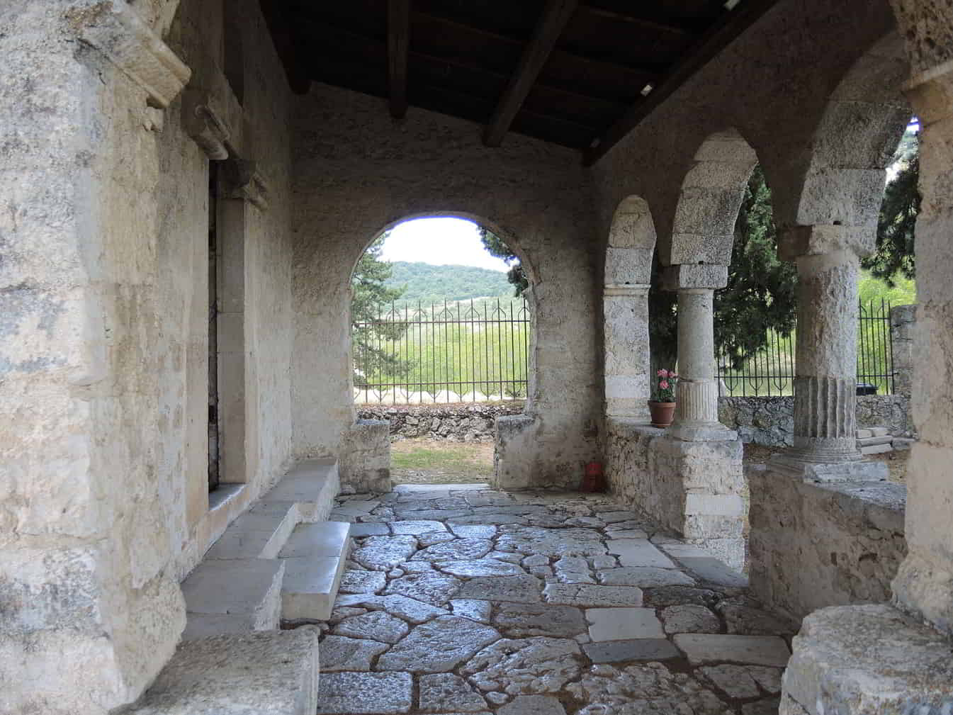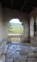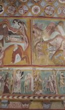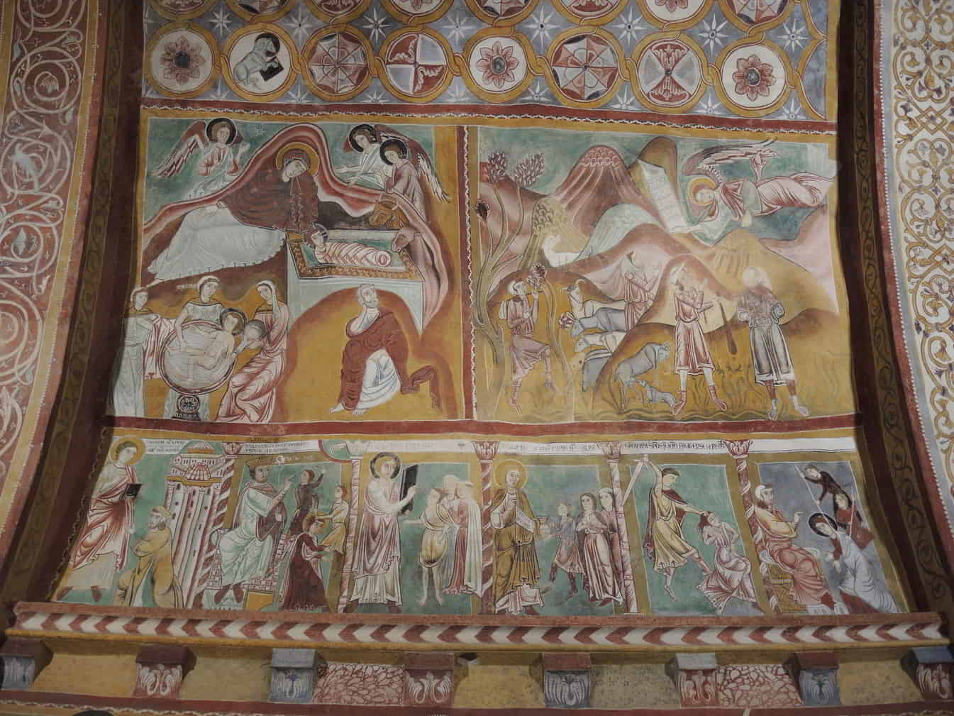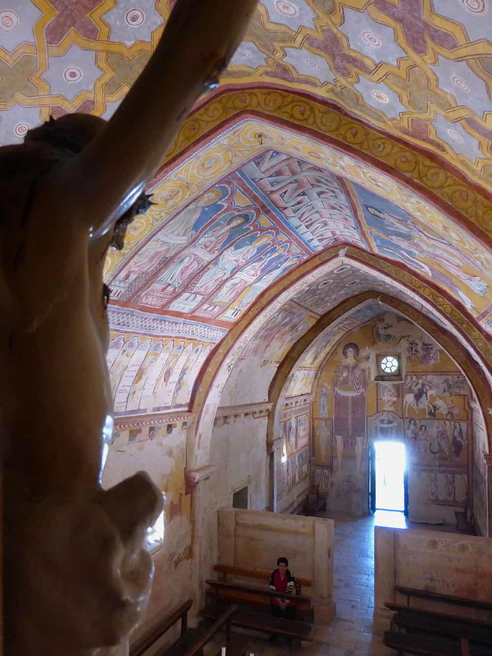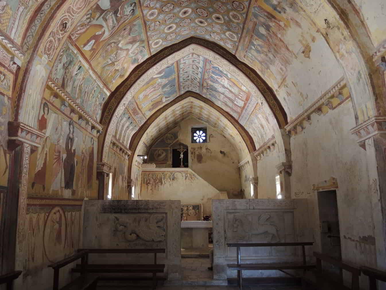 Ma gli affreschi più interessanti sono quelli lungo la parete destra: descrivono un calendario monastico, accanto ad un'immagine allegorica del Santo principale del mese o dell'attività agricola c'è una pagina bianca con i giorni e le memorie liturgiche, con particolare riferimento ai Santi dell'Ordine benedettino; infine, a separare la zona destinata aia pellegrini, da quella dei monaci, ci sono due transenne marmoree scolpite con l'immagine di un drago ed un grifone.