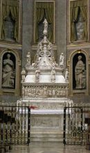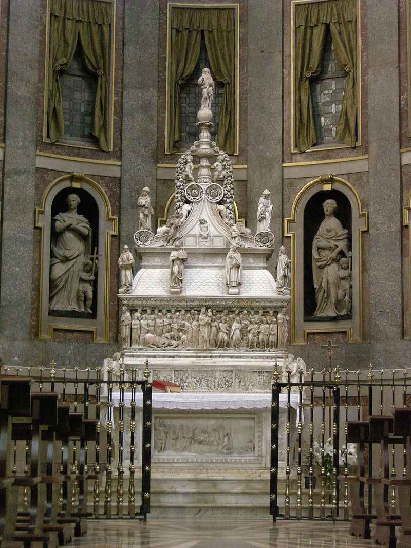 Nel 1233, mentre i lavori di costruzione della basilica e del convento erano in corso, i resti di Domenico furono collocati in una cassa di cipresso, a sua volta racchiuso in un semplice sarcofago marmoreo, e collocati dietro l'altare di una cappella laterale della navata destra (dove ora sorge la seicentesca Cappella di San Domenico). L'anno successivo, precisamente Il 13 luglio 1234, Domenico fu canonizzato da papa Gregorio IX. Allo scopo di rendere visibile il sepolcro ai fedeli, accorrenti sempre più numerosi dopo la canonizzazione del santo, nel 1267 i suoi resti furono posti in un monumento più insigne decorato ad opera di Nicola Pisano e dei suoi allievi.
