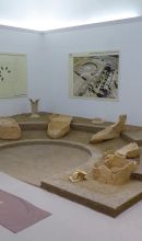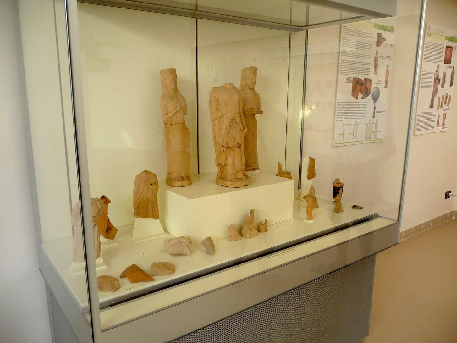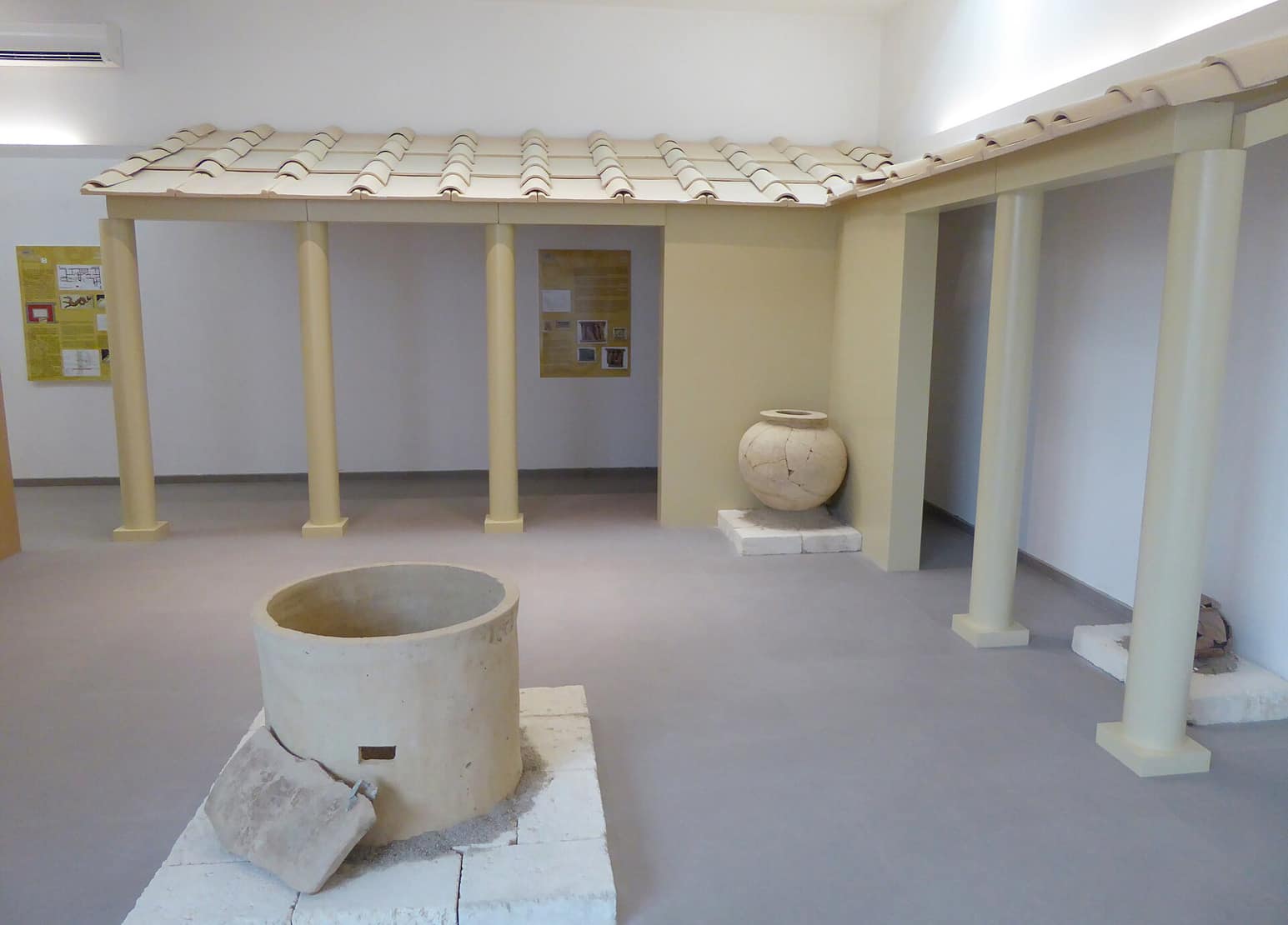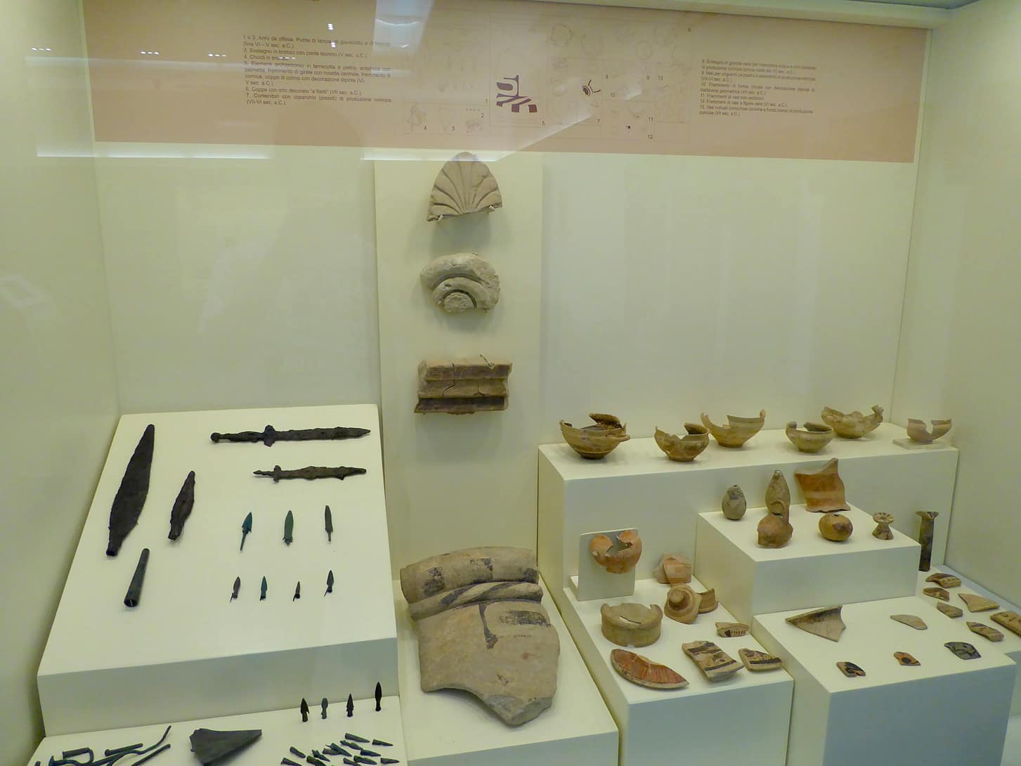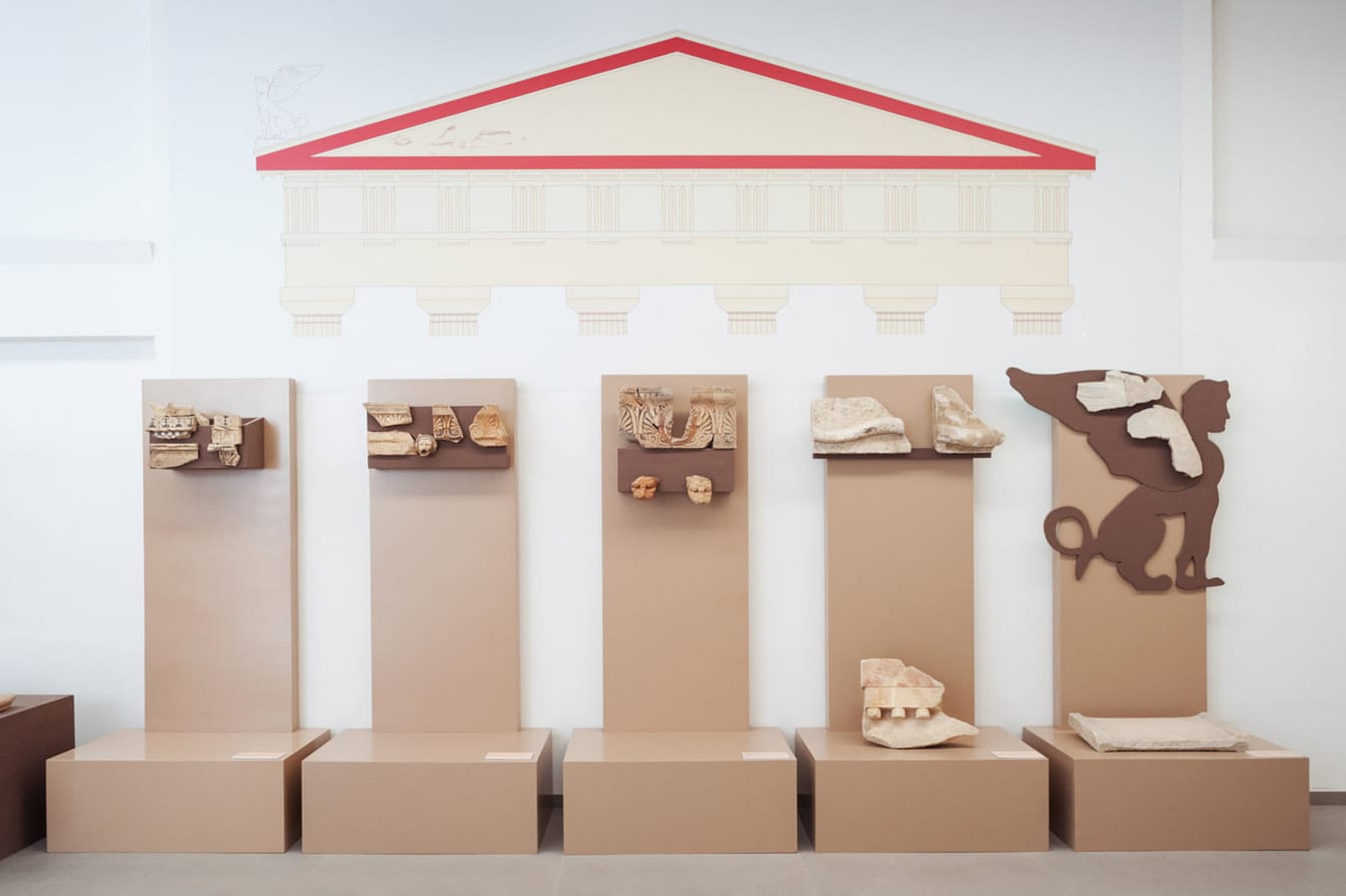 L’interno accoglie vari tipi di reperti e manufatti: splendidi sono i resti di un tempio, di cui non si conoscono le dimensioni, riferibili a tre fasi costruttive diverse e consistenti in una sima (cornice) costituita da lastre policrome e in bellissime grondaie a testa leonina.
