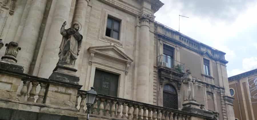 Il corpo della chiesa si erge con il prospetto di pietra calcare, rivolto con tre porte a ponente; il sagrato è preceduto da una scalinata di pietra lavica dell'Etna, con un cancello in ferro battuto ed una balaustrata con quattro pilastri che sorreggono le statue imponenti, rappresentanti da sud a nord: San Giuseppe da Copertino, Sant'Agata, Santa Chiara d'Assisi e San Bonaventura.