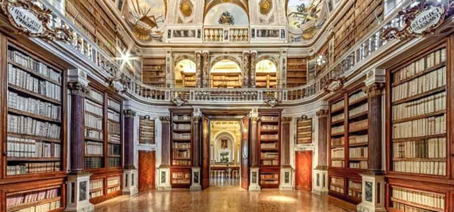Situata nel convento francescano risalente alla seconda metà del XIV secolo, la libreria dei Minori conventuali costituisce il nucleo più antico dell’attuale biblioteca comunale. Nel 1761 l’architetto Cosimo Morelli viene incaricato dai religiosi di realizzare una elegante libreria a pianta quadrata, con una balaustra in legno a dividere le pareti in due ordini di scaffali. La volta, affrescata da Alessandro Della Nave e Antonio Villa con decorazione illusionistica, raffigura una balconata con lucernai attraverso i quali si intravede il cielo, con parti in stucco e finti marmi.