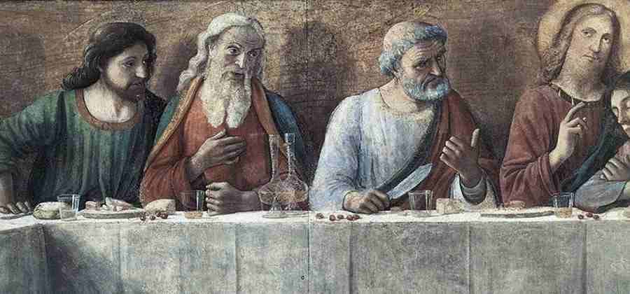 Attraverso le due aperture oltre la spalliera degli apostoli si vedono le cime degli alberi di un giardino, in cui volano numerosi uccelli. Si tratta di precisi elementi simbolici, legati ai temi della Passione e resurrezione di Cristo: la palma del martirio, le melograne e le rose rosse (nel vaso), simboli del sangue, le coppie di uccelli in volo, simbolo dei cicli della natura che si rinnovano, il pavone, simbolo di immortalità, ecc.; si vedono poi un falco sulla sua preda, un'anatra e dei cardellini. Tra i cespugli si riconoscono anche agrumi, mele e datteri. Alcuni di questi frutti si trovano anche sulla tavola degli apostoli, a eccezione delle ciliegie (altro frutto rosso), che non hanno un corrispettivo nel giardino. Le caraffe sul tavolo sono colme di acqua e vino bianco, mentre tra gli alimenti si riconoscono pane, prosciutto e formaggi su taglieri. Pietro ad esempio, che ha il bicchiere vuoto, sembra aver appena finito di tagliare il proprio formaggio a pezzetti sulla tavola, secondo un gusto amorevole verso il dettaglio che ha la sua origine nell'emulazione delle opere nordiche.