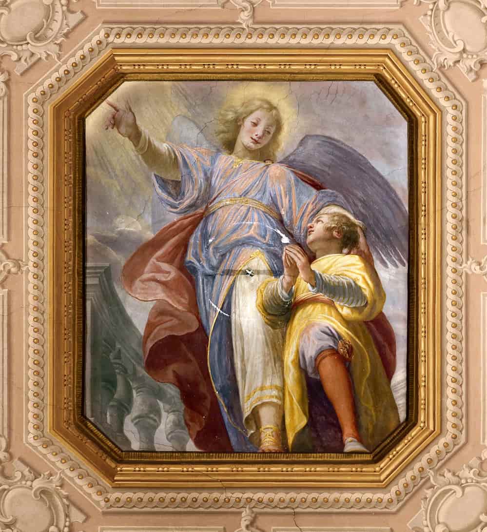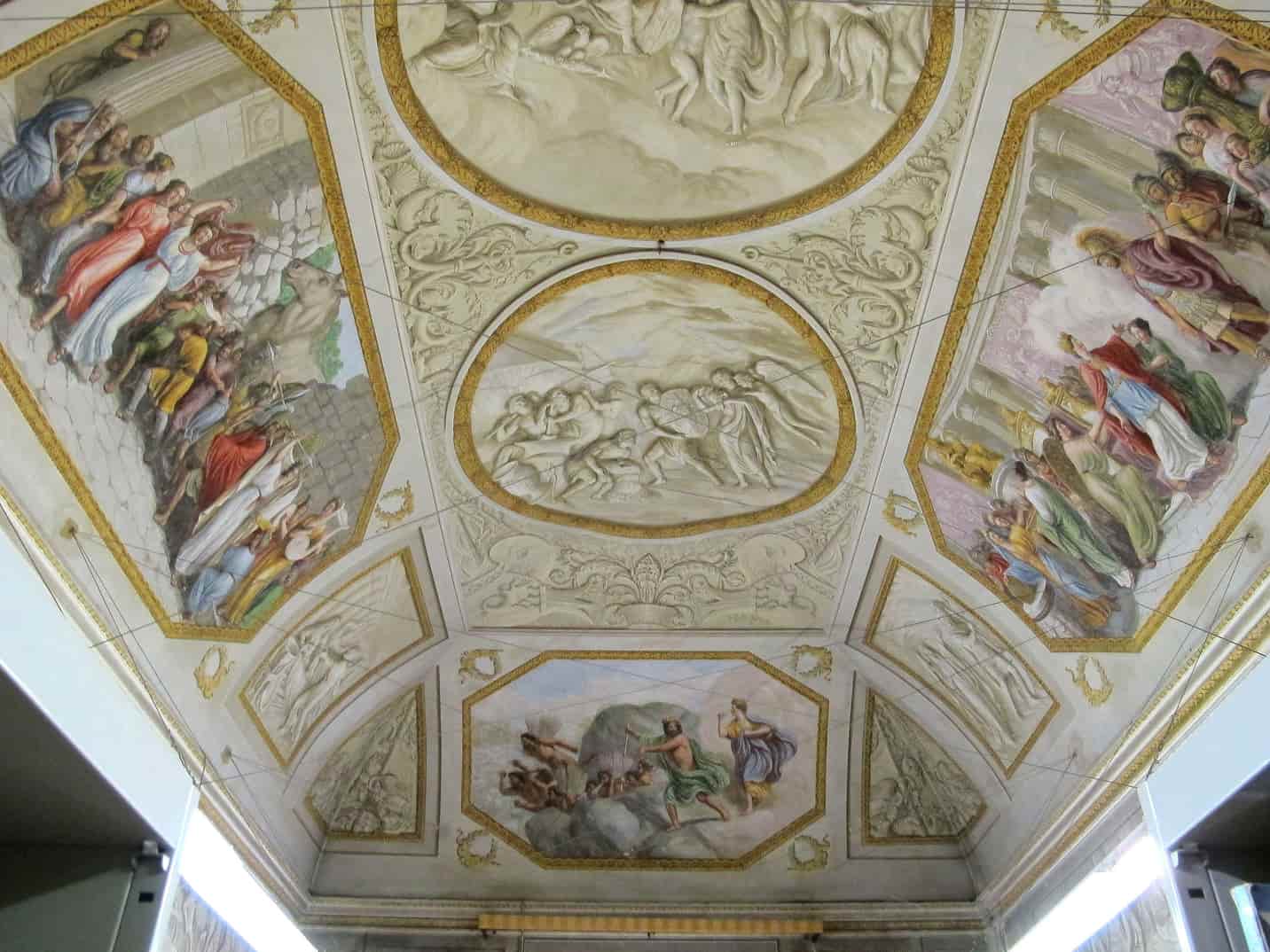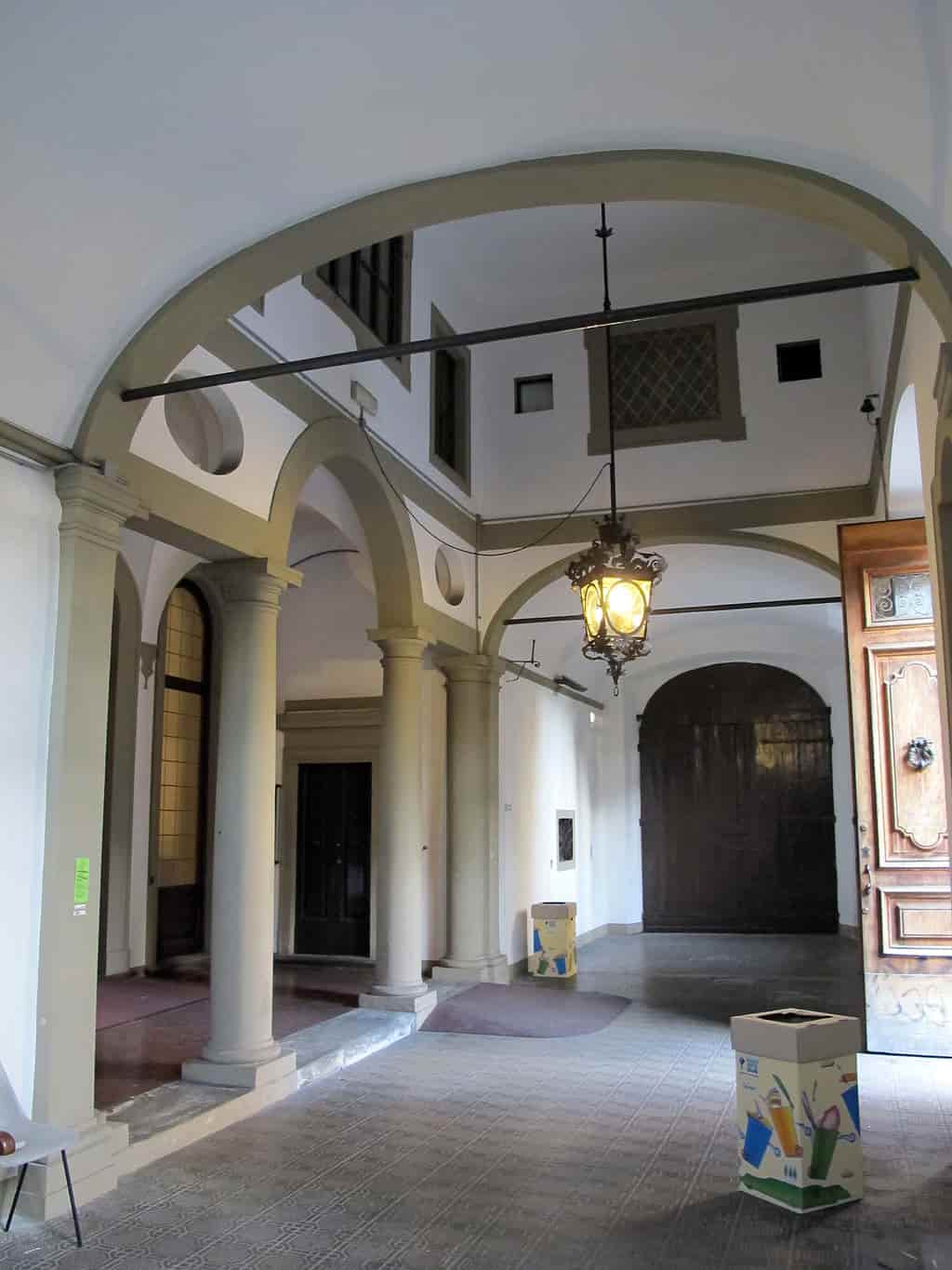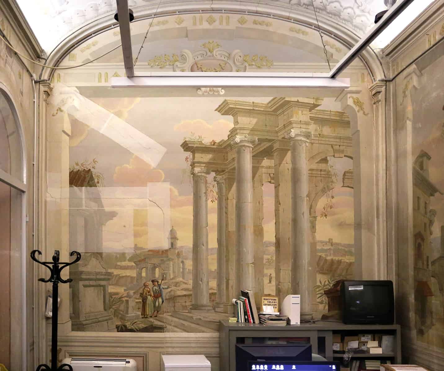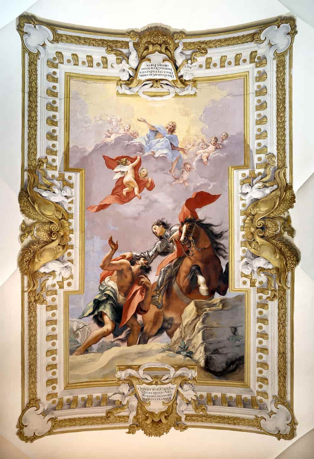 La sala biblioteca, illuminata dalle ampie finestre sul giardino, presenta sul soffitto l'affresco più famoso di quelli del palazzo, San Martino che dona il mantello a un povero di Baldassarre Franceschini detto il Volterrano, eseguito nel Seicento per il suo committente e protettore Vieri Guadagni. La grande scena mostra l'influsso di Peter Paul Rubens, con una verosimile prospettiva dal basso verso l'alto e un notevole uso del colore con tonalità a volte tenui e opaline a volte crude e cangianti.