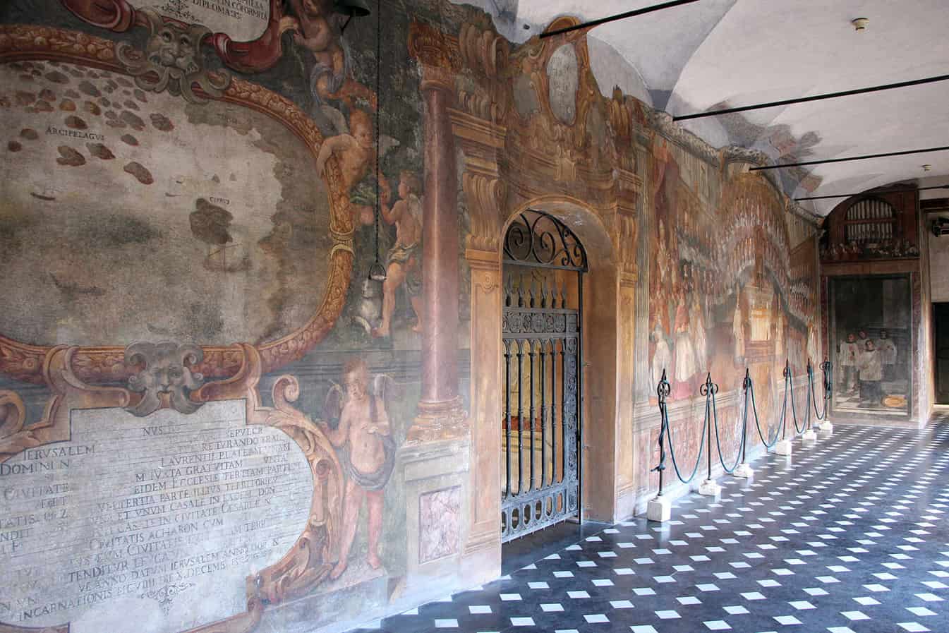 Il percorso di visita continua al piano primo, costituito da un ampio ambulacro sul quale si aprono le antiche stanze private dei canonici: durante gli interventi di restauro, la pareti di queste sale hanno rivelato pregiati affreschi risalenti alla fine del XIII secolo. Le prime due sale sono dedicate all’esposizione di vesti processionali e argenti, a rotazione; le sale successive alternano sale a tema (“La macchina d’altare”, “Gli apparati processionali”) ad altre in cui sono presentate opere che illustrano l’arte genovese fino al XIX secolo.