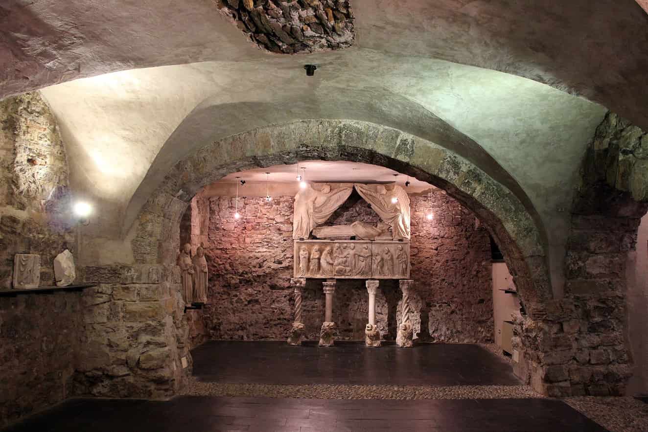 Il percorso museale segue un ordinamento cronologico, intervallato da sale a tema e prende avvio dal piano dei fondi in cui è allestita la collezione archeologica, composta da reperti inerenti la storia del sito, e il grandioso Monumento funebre del cardinale Luca Fieschi (XIV secolo).