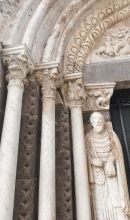 Sulla facciata principale si aprono tre portali finemente decorati. Quello centrale, in marmo bianco, è molto strombato e fiancheggiato da due colonne scanalate a tortiglione. Presenta due leoni sovrastati da una lunetta con quattro archi sorretti da doppie colonne e con differenti capitelli. Negli stipiti sono scolpite le figure degli apostoli Pietro e Paolo, in parte ricostruite dopo un atto vandalico. Nella lunetta sono poste le figure della Madonna con Bambino Benedicente e da sinistra, Balaam sull'asina, il Sacrificio di Isacco e l'Agnus Dei, simili ad archetipi lombardi.