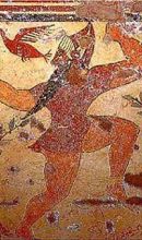 La necropoli etrusca dei Monterozzi è posta su un'altura a est di Tarquinia e possiede circa 6 000 sepolture le più antiche delle quali datate al VII secolo a.C. Circa 200 tombe contengono una serie di affreschi che rappresentano il più cospicuo nucleo pittorico a noi giunto di arte etrusca e al tempo stesso il più ampio documento di tutta la pittura antica prima dell'età imperiale romana. Le camere funerarie, modellate sugli interni delle abitazioni, presentano le pareti decorate a fresco su un leggero strato di intonaco, con scene di carattere magico-religioso raffiguranti banchetti funebri, danzatori, suonatori di aulós, Giocoleria, paesaggi, in cui è impresso un movimento animato e armonioso, ritratto con colori intensi e vivaci. Dopo il V secolo a.C. figure di demoni e divinità si affiancano agli episodi di commiato, nell'accentuarsi del mostruoso e del patetico.