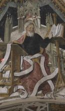 L'interno ospita uno dei più importanti cicli di affreschi del Quattrocento ligure, realizzati dal pittore Giovanni Canavesio, che li firma e data 1482, gli Evangelisti e i Dottori della Chiesa delle due volte, scene della Passione e del Giudizio Universale sulle pareti.