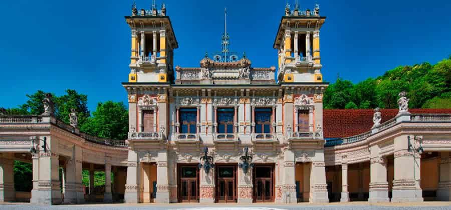 Il casinò di San Pellegrino Terme, inaugurato il 20 luglio 1907, è opera dell’architetto milanese Romolo Squadrelli e dell’ingegner Luigi Mazocchi. Costriuito in soli venti mesi è considerato una delle maggiori espressioni dello stile liberty in architettura, conosciuto in tutta Europa. La sfarzosità e l’eleganza della struttura è ammirabile già dall’esterno. La facciata è al tempo stesso leggiadra e ricca di stucchi, bassorilievi ed elementi in vetro e ferro battuto di straordinaria fattezza. Ogni decorazione è studiata nel dettaglio per essere inserita armonicamente con altri elementi e per comunicare nel contempo lo spirito del tempo.