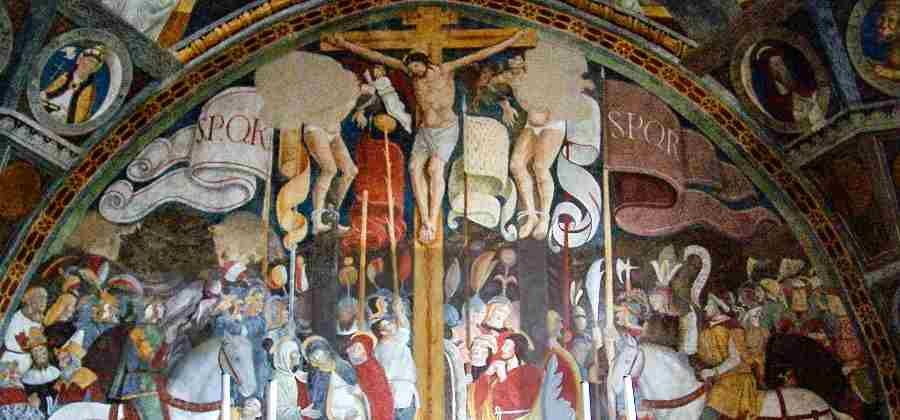 L'interno presenta l'aula unica, tipica della tipologia della pieve rustica, con un loggiato in controfacciata e con tetto a capanna, copertura lignea della navata e volta in muratura nella zona presbiteriale. La navata e il presbiterio si presentano completamente affrescati da Giovanni Pietro da Cemmo, che lavorò in questa chiesa tra il 1491 ed il 1493. Il programma decorativo risulta particolarmente complesso e denuncia, per l'unità e finezza teologica, una committenza di alto livello. Tale ipotesi è confermata dalla presenza di stemmi sparsi un poco ovunque appartenenti a famiglie della nobiltà camuna, come i Beccagutti e i Federici.