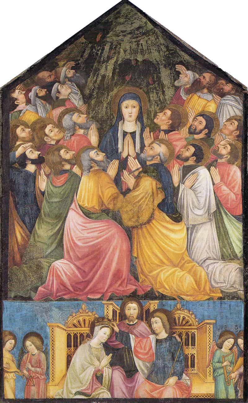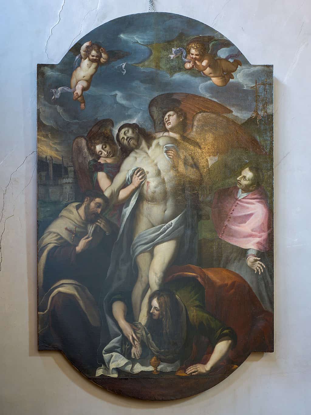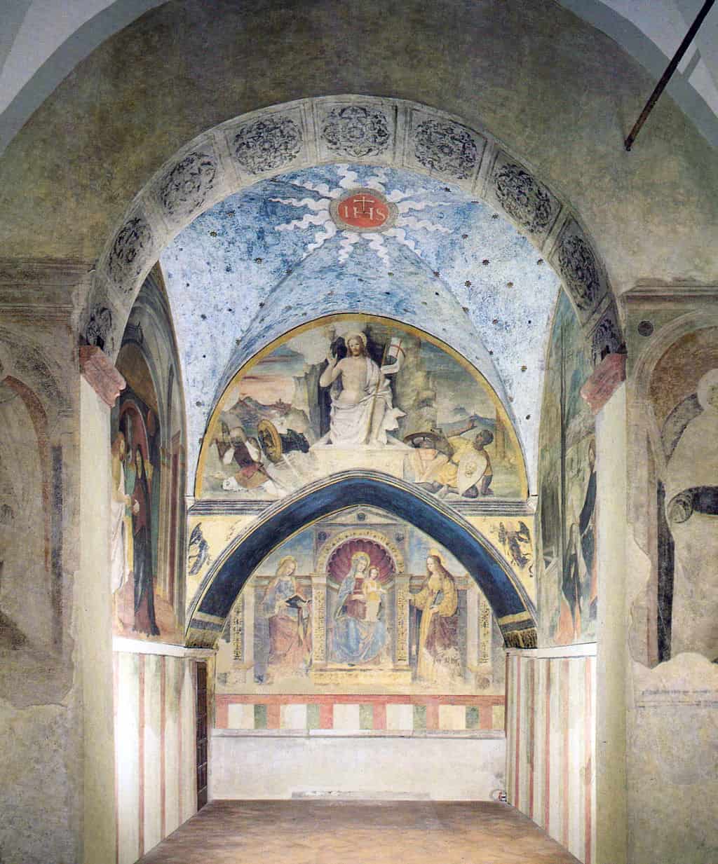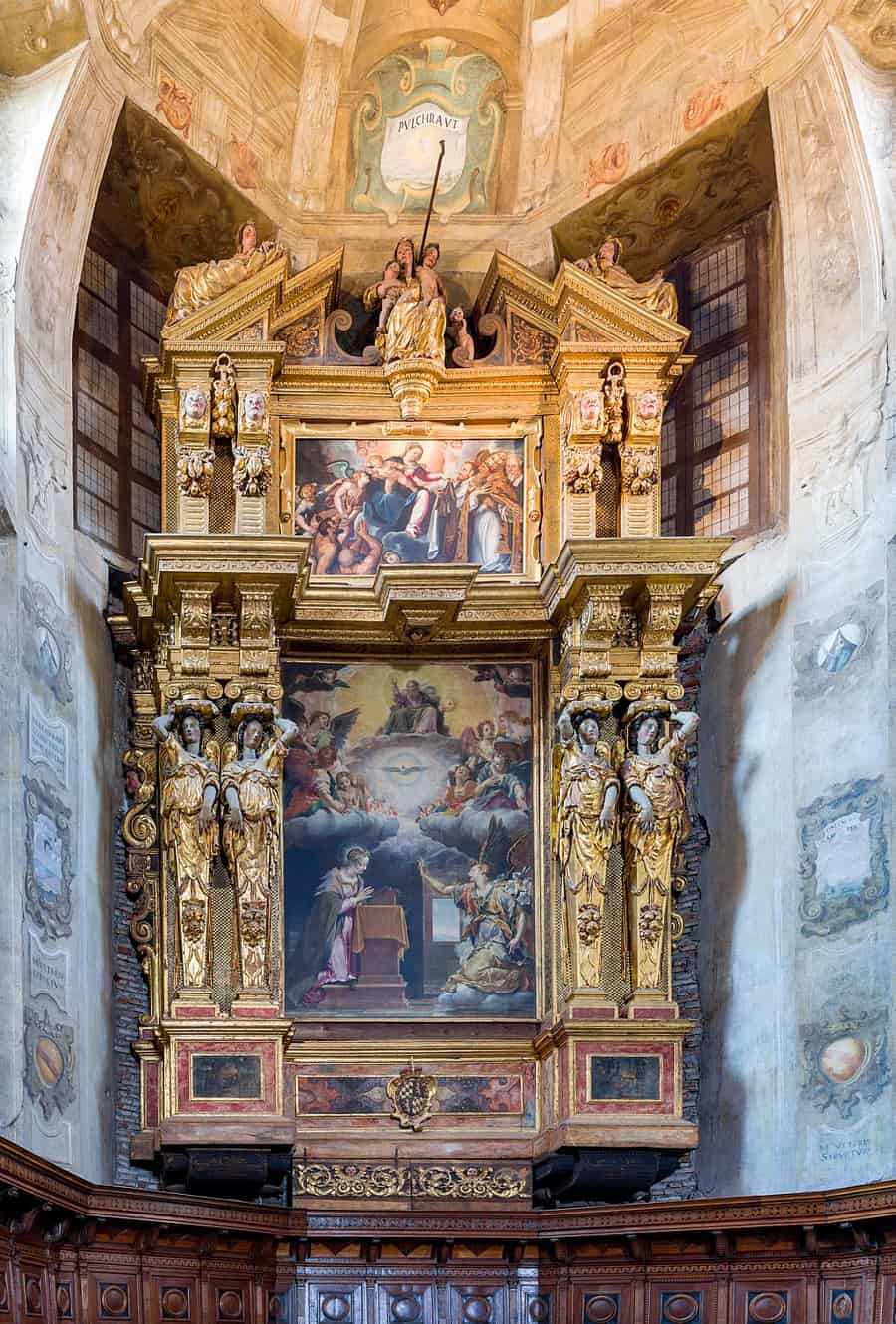 La prima cappella della navata destra conserva all'altare la pala dei Disciplini, affresco doppio eseguito nell'ambito di Paolo da Caylina il Vecchio e Andrea Bembo.