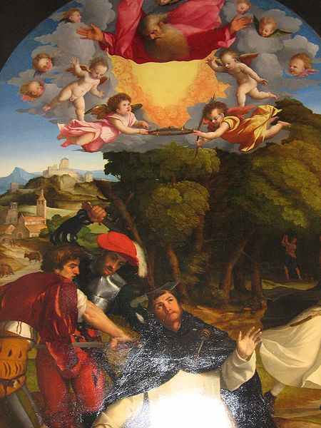 Già salendo la scalinata si può notare il dipinto su tela di Giovanni Raggi, che raffigura l'episodio biblico de “La benedizione di Balaam” (risalente al 1767). Sul pianerottolo si aprono tre sezioni: a sinistra si trova la prima, suddivisa in tre ambienti che comprendono vari paramenti sacri, la pala del martirio di San Pietro di Palma il Vecchio, il dipinto di Andrea Previtali, raffigurante Sant'Antonio abate, San Cristoforo e San Nicola da Tolentino; e la tela Giaele uccide Sisara, di Enrico Albricci (1767). La seconda sezione prevede una ricca esposizione di vari arredi liturgici, tra cui paramenti, ostensori, calici e libri sacri scritti a mano. La terza ed ultima sezione comprende, nell'ordine, opere di artisti del calibro di Antonio Marinoni, Gian Paolo Cavagna e Carlo Ceresa. Poco più avanti si trova una saletta in cui è conservato il San Cristoforo, tela attribuita a Jacopo Robusti, noto col nome di Tintoretto, ed al figlio Domenico.