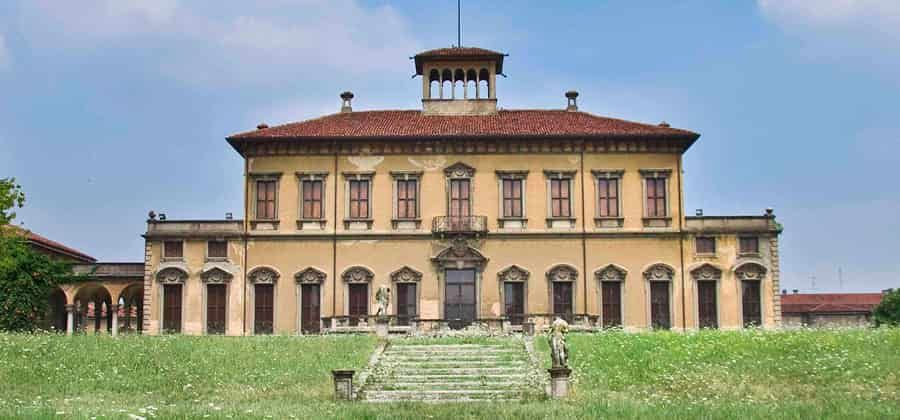 La costruzione si erge in fondo ad un lungo viale costeggiato di pioppi e tigli. Nello spazio antistante alla villa si sviluppa un'ampia corte d'onore con il porticato. La base dell'edificio è costituita da un blocco lineare e sulla sua sommità spicca la loggia realizzata grazie al recupero delle colonne dall'ormai demolito convento milanese di Sant'Erasmo di epoca quattrocentesca.