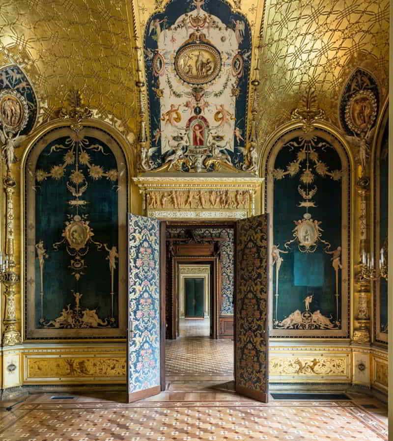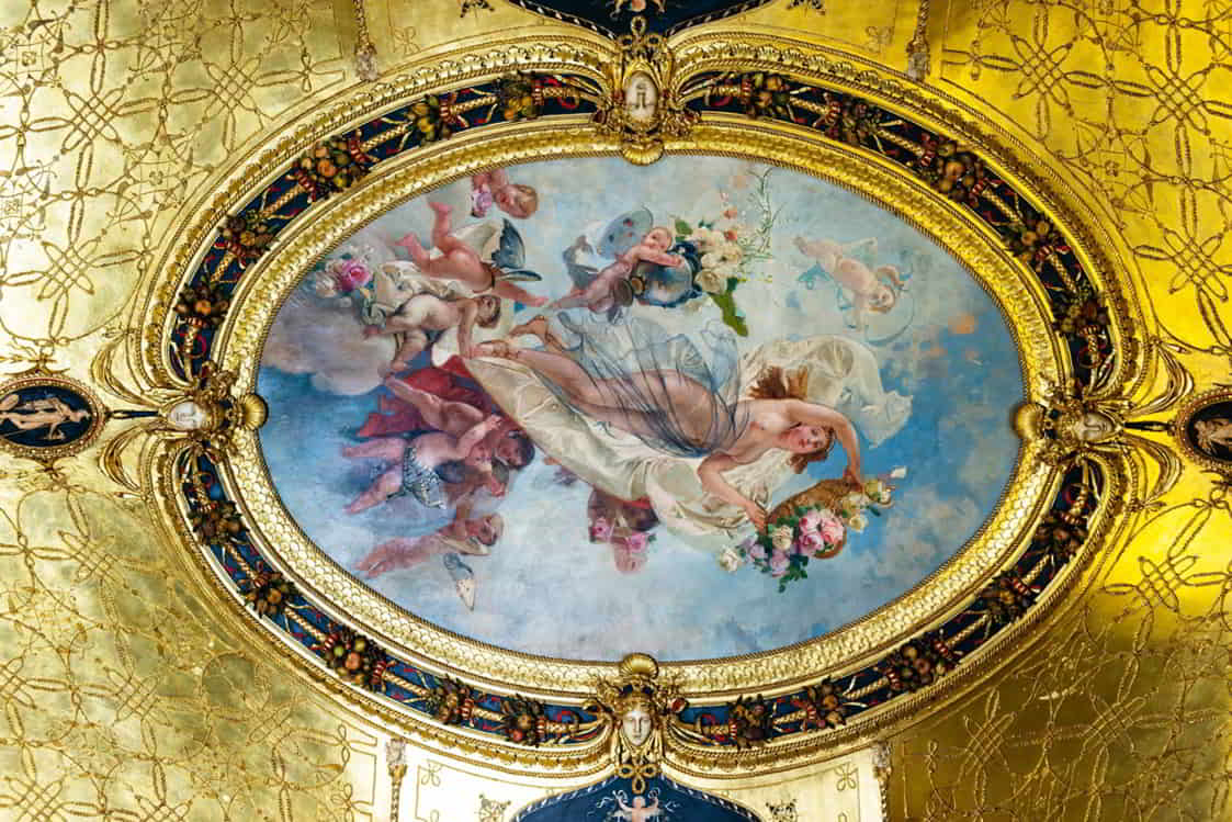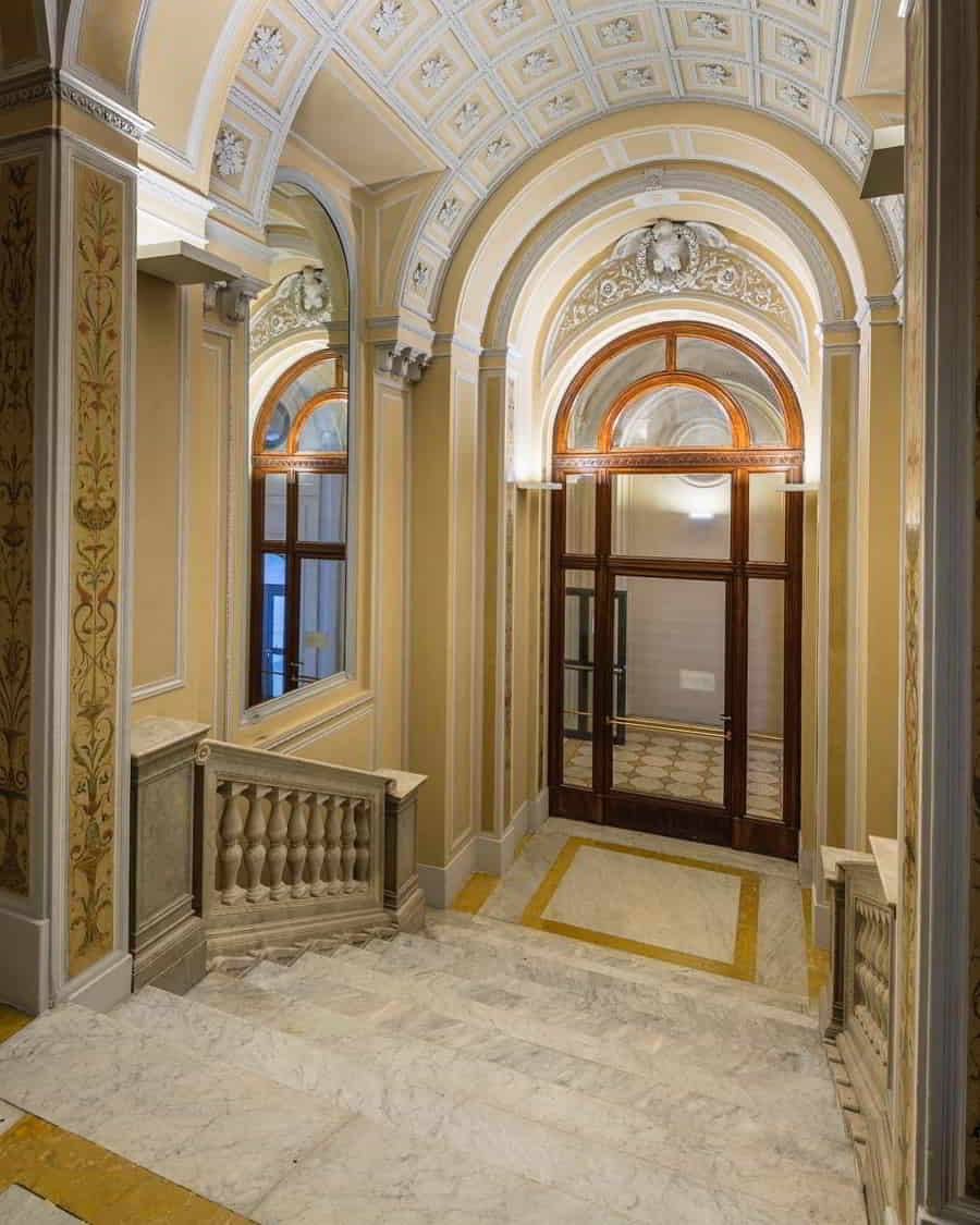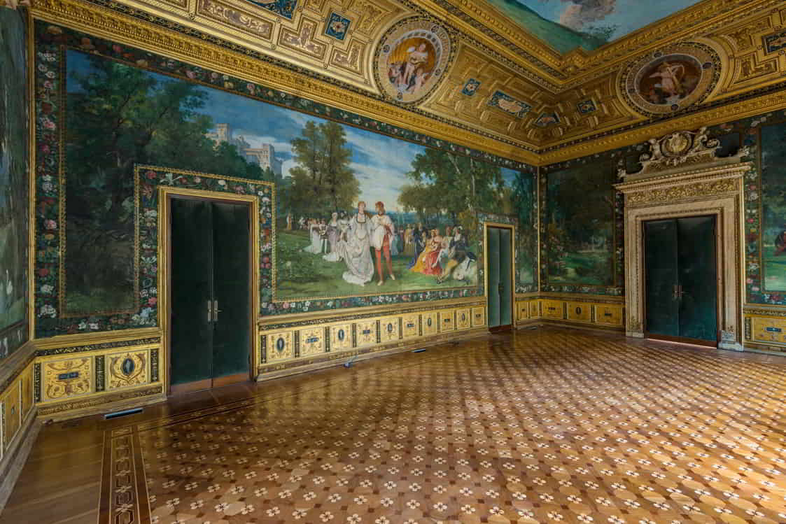 Molto ricchi sono gli interni, di cui si segnalano: la "Sala di Flora", detta anche salottino azzurro, tappezzato in velluto di seta, con specchiere, decorazioni e sculture di Lodovico Pogliaghi, e affrescato da Mosè Bianchi; la "Sala di Prometeo", cosiddetta per il grande camino neorinascimentale sormontato dalla scultura di Prometeo sempre del Pogliaghi; il Salone da ballo affrescato alle pareti con "Il Ballo" da Giuseppe Bertini e, nel soffitto, da Luigi Cavenaghi. Il palazzo ha ospitato per tutto il Novecento la sede della Famiglia Meneghina, celebre circolo privato milanese.