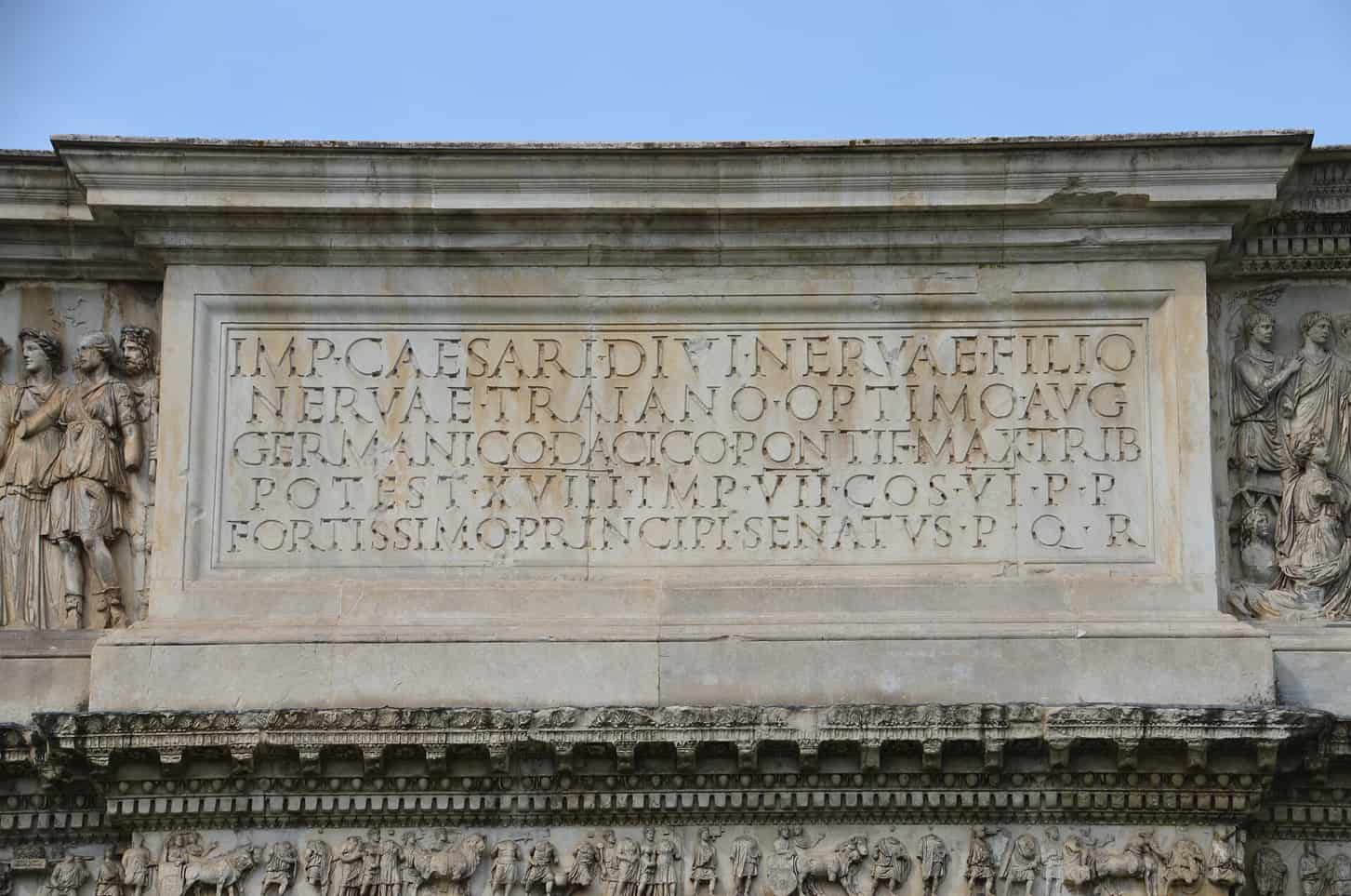 Il fregio figurato della trabeazione sorretta dalle colonne raffigura la processione del trionfo di Traiano sulla Dacia, come di consueto realizzato ad altissimo rilievo.