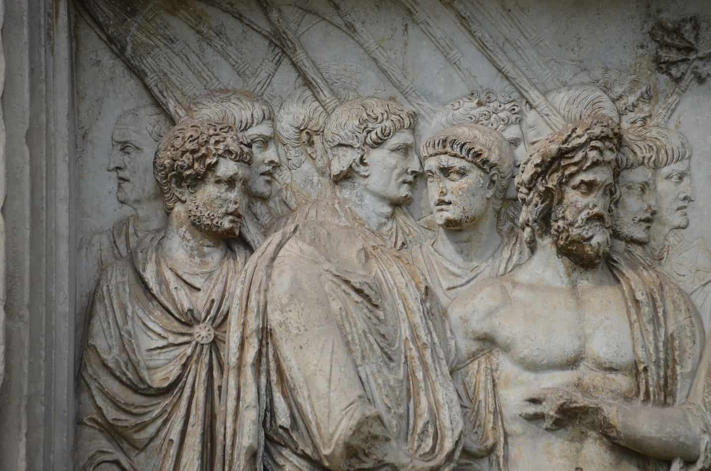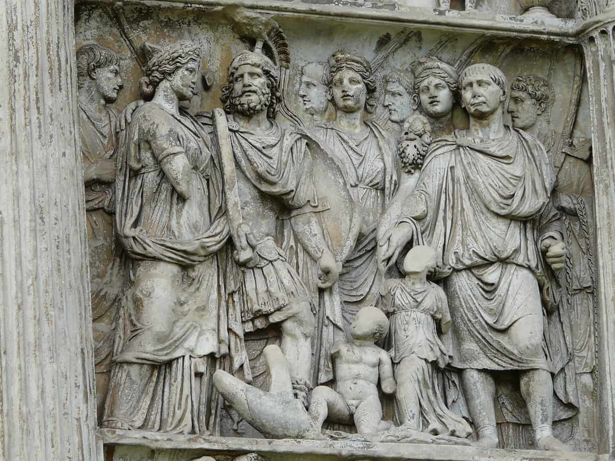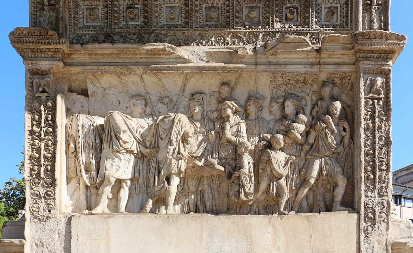 L'arco presenta una ricca decorazione scultorea sulle due facciate principali: su quella interna, quella rivolta verso le città, sono raffigurate scene che si riferiscono alla pace e alle provvidenze verso i cittadini, mentre sul lato esterno sono raffigurate scene riferite alla guerra e alle provvidenze dell'imperatore verso le province.