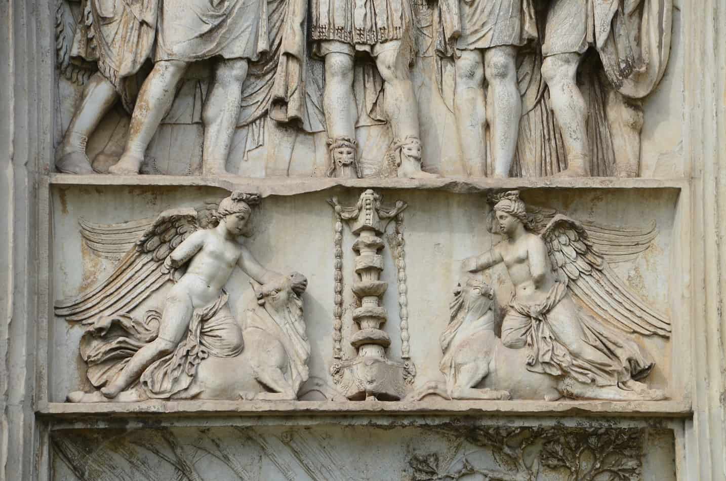 Su ciascuno dei piloni, tra le semicolonne angolari, altri due pannelli, posti l'uno sull'altro, più stretti di quelli presenti sull'attico, raffigurano ancora scene e allegorie delle attività imperiali; i pannelli sono separati da rilievi decorativi più bassi con Vittorie tauroctone (Vittorie nell'atto di sacrificare tori) al centro e Amazzoni in alto.