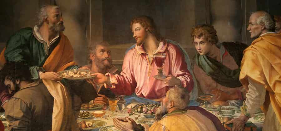 Sullo sfondo scuro e geometrico, con due colonne tortili, si stagliano i colori brillanti delle vesti degli apostoli, spesso accordate a toni setosi e cangianti, e arricchite da pieghe frastagliate. Evidente è anche il fasto del Cinquecento maturo, col moltiplicarsi delle vivande, dei vasellami e dei servi.