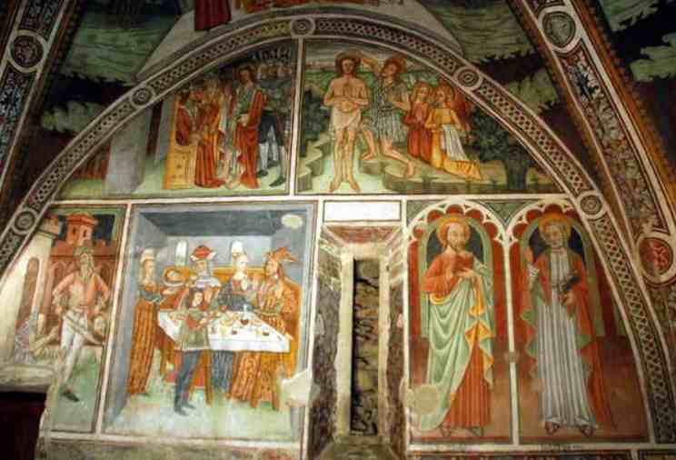 L'interno, ad una sola navata, è quasi interamente coperto da affreschi, di autore anonimo, ma ritenuti di Maestro di scuola cuneese del tardo quattrocento che rappresentano il Cristo in croce (andato perduto per la successiva apertura di una finestra!) circondato dai dodici Apostoli; sulla volta sono rappresentati i quattro Evangelisti mentre sui fianchi ci sono varie scene della vita di san Giovanni Battista. Sulla parete destra della navata ci sono altri affreschi quasi certamente eseguiti da un altro Maestro anonimo in epoca leggermente posteriore.