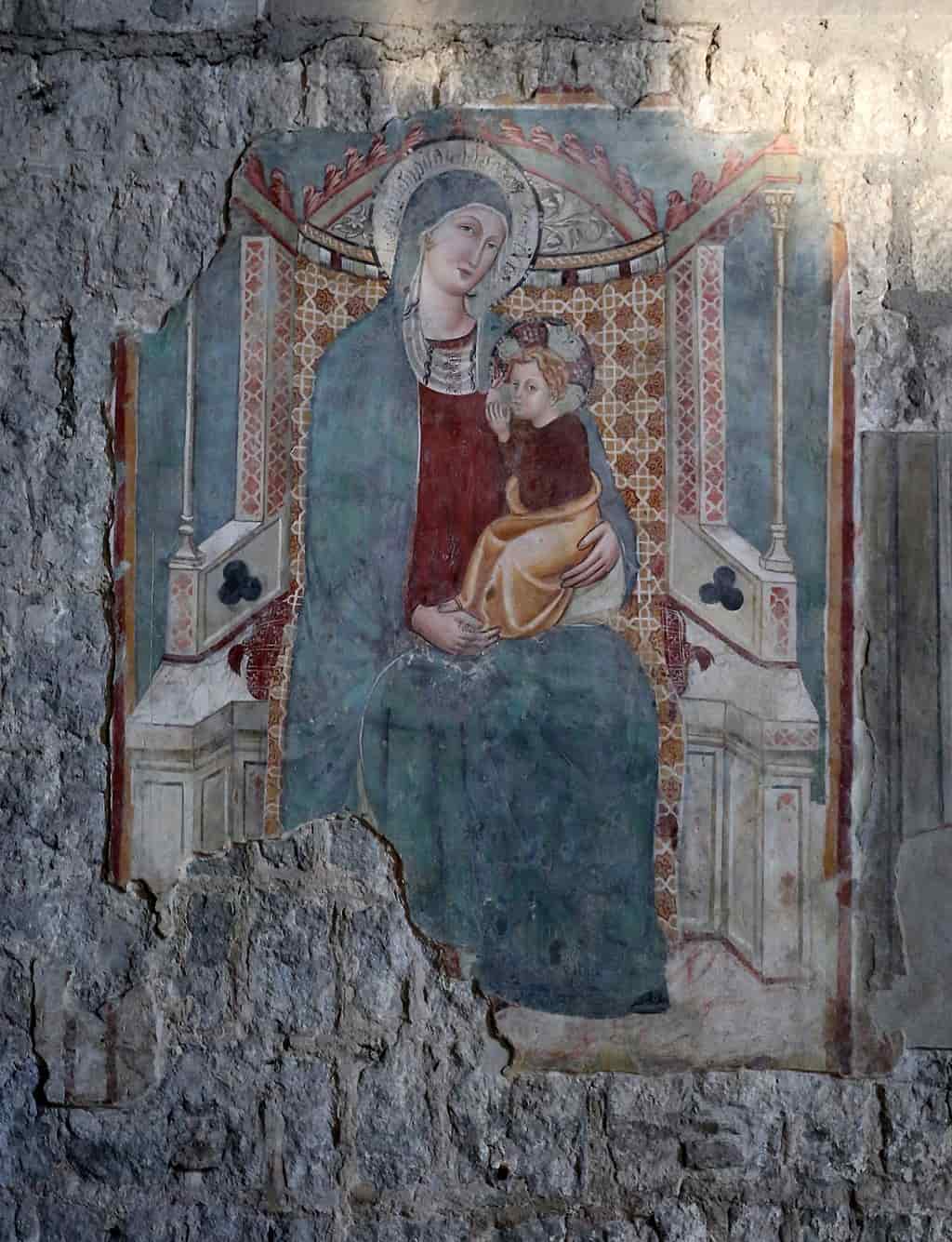 L'interno si presenta a croce latina con una profonda navata unica di forme romaniche, su cui si innestano gli altari rinascimentali e il transetto gotico, introdotto da un grande arco ogivale su quattro colonne pensili. L'interno è rischiarato da monofore e bifore. La copertura è a capriate lignee, decorate da pianelle dipinte, in gran parte ricostruite dopo la guerra ma con alcune originali del XV secolo, con firma di Paolo di Matteo. In controfacciata si trova un affresco staccato attribuito a Lorenzo da Viterbo o al Balletta, con l'Annunciazione (copia da quella nel Pantheon di Melozzo da Forlì) e i Santi Antonio Abate, Marta e Maddalena.