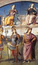 A destra si accede alla Sala delle Udienze, a base rettangolare coperta da volte ogivali, che generano una serie di lunette affrescate dal Perugino. Un alto è occupato da Tribunale, bancone ligneo a due ordini di seggi intagliato e intarsiato, sormontato da una lunetta con due grifi tra ghirlande che inquadrano la statuetta in terracotta della Giustizia, attribuita a Benedetto da Maiano. Un altro banco presenta intarsi di Antonio da Mercatello (1508). A metà della parete di fondo si trova una ringhiera con un piccolo pulpito rinascimentale, opera di Antonio Masi d'Antonio (1562).