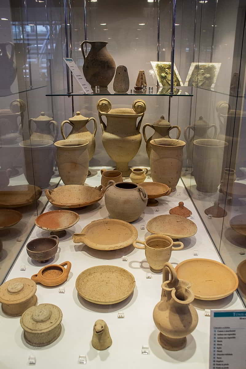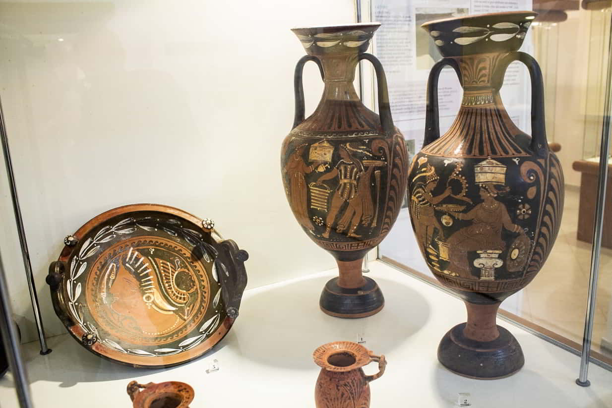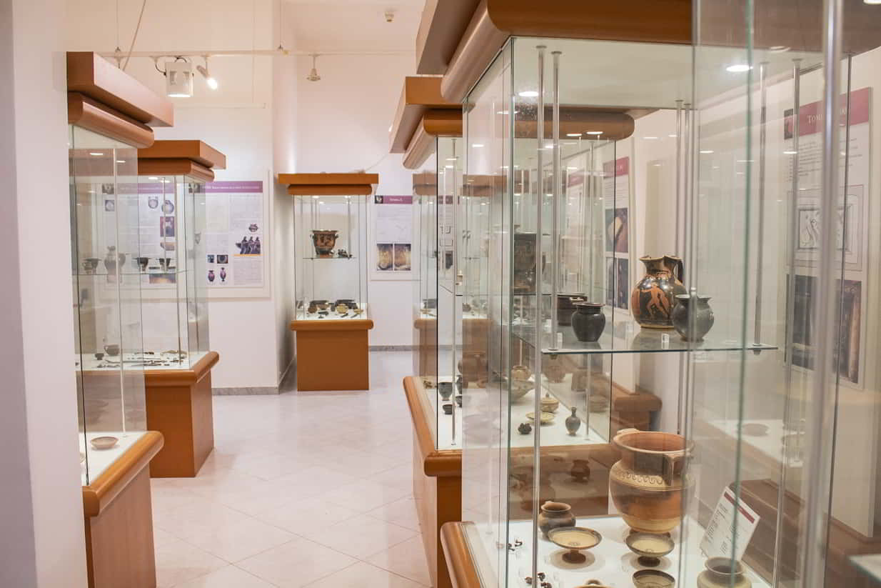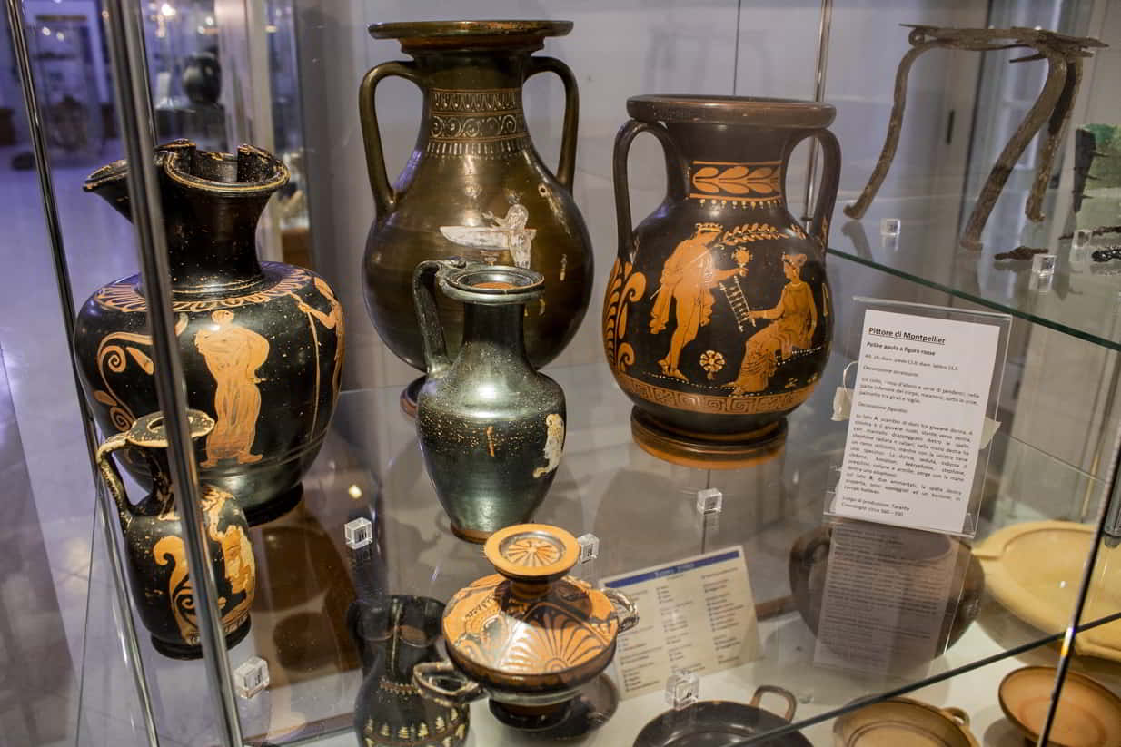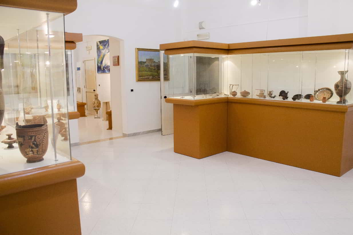 I reperti esposti provengono da quella che è stata chiamata la necropoli di Via Traiana (dalla principale arteria stradale, di età romana, che attraversa l’area della necropoli) e sono databili tra il VI e il III secolo a.C.. Dell’insediamento abitativo invece non si ha, o non si ha ancora, traccia. La credenza nella vita oltre la morte richiedeva nella società peucezia, come nella società greca, che il defunto venisse seppellito con una serie di oggetti che potevano essergli utili nell’aldilà e che costituivano il corredo funerario. La collezione museale è per lo più costituita dal corredo rinvenuto nelle tombe.