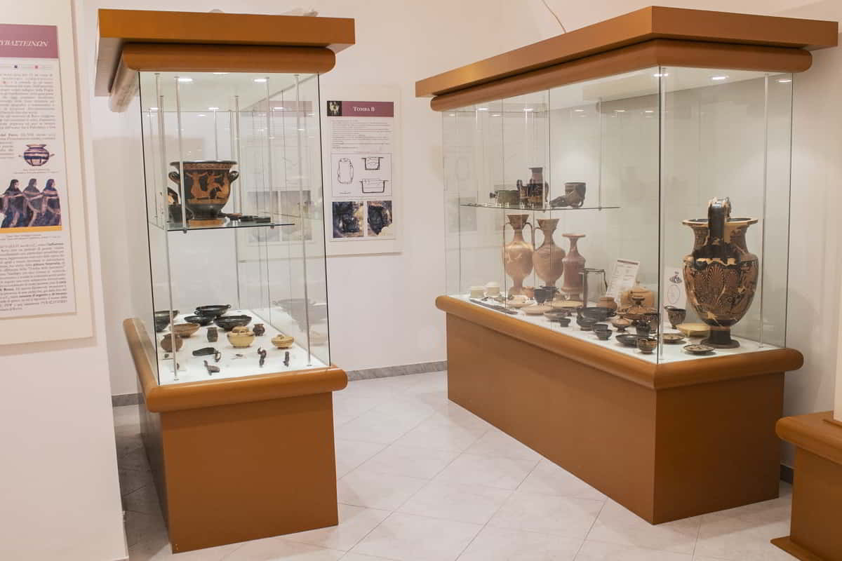 Il percorso è organizzato in tre sale e ricostruisce le dinamiche sociali e culturali della civiltà peucezia nel centro cittadino attraverso l’evoluzione nei secoli dei corredi funerari. È noto che la pratica funeraria più diffusa in Puglia era quella dell’inumazione e, in particolare, il defunto veniva sepolto in posizione fetale, ovvero rannicchiato sul fianco. Questa è la posizione più frequente nelle sepolture più antiche.