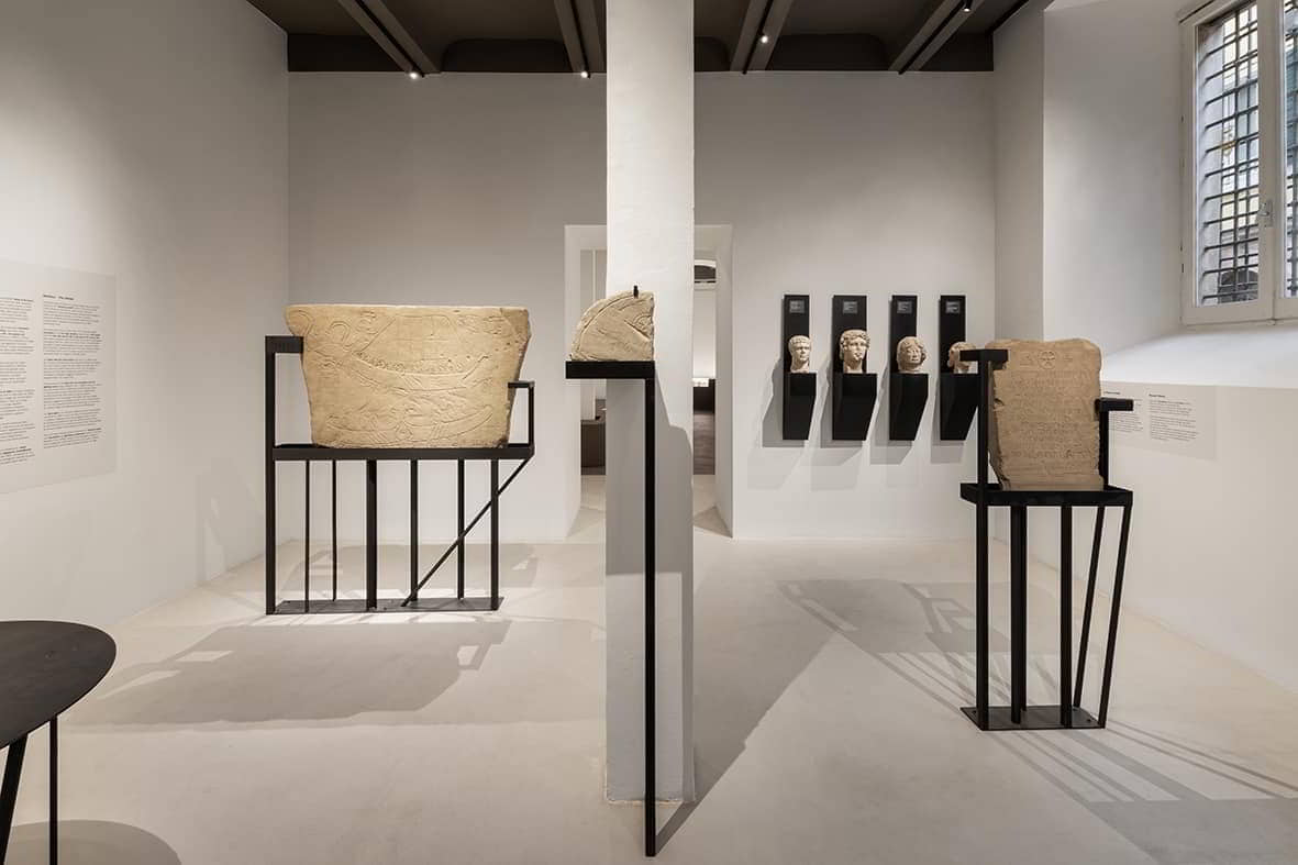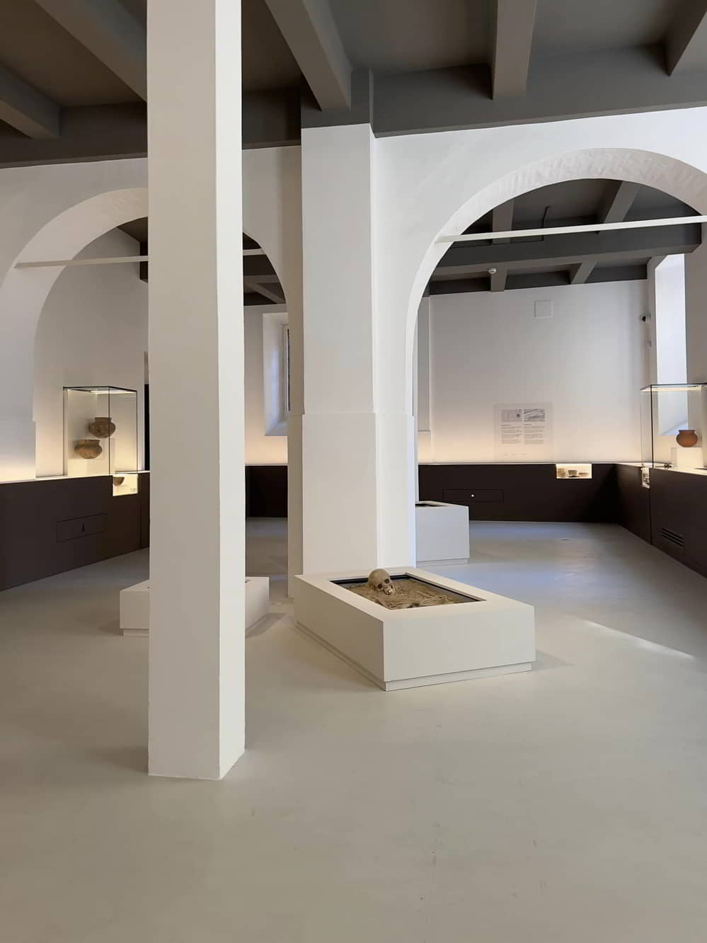 Il museo occupa una superficie di 522,4 mq. al piano terra parzialmente interrato a partire dall’ala destra del palazzo dal cui androne, che ospita una statua di matrona romana e basi marmoree con iscrizioni, si accede a tre grandi sale con volte a crociera. Gli oggetti in esposizione sono circa 2600. La prima sala espone reperti di vario genere di epoca romana, prevalentemente da collezione dell’Olivieri: ritratti in marmo, fondi di coppe vitree graffite e iscritte, un larario puerile e parte della collezione numismatica.