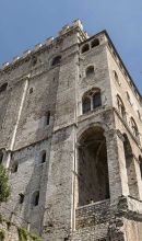 Allestita nella sala della loggetta e lungo il corridoio segreto, la raccolta di ceramica spazia dalle maioliche arcaiche (XIV sec.) ai manufatti del XIX sec. Di particolare rilievo è la produzione eugubina rinascimentale a lustro rosso e dorato della bottega di Mastro Giorgio Andreoli (XVI sec.) Numericamente significativo è il vasellame farmaceutico tra cui originali duomi d'alambicco in terracotta rossa.