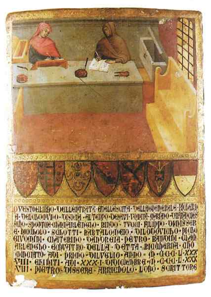 Le pitture si trovano sempre nella parte superiore del legno, mentre nella parte inferiore c'è una scritta con la data ed i nomi dei componenti dell'Ufficio della Biccherna, contornata dagli stemmi delle loro famiglie.