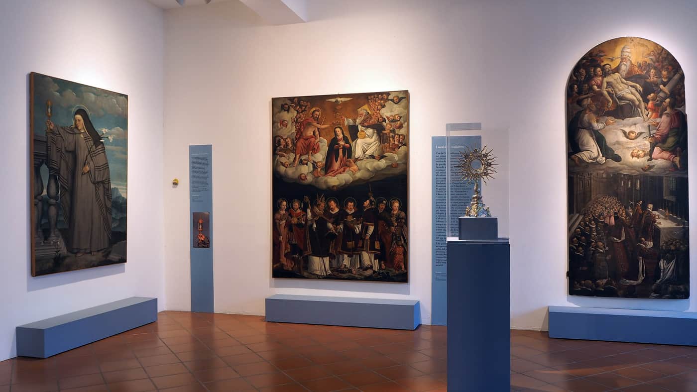 Le pinacoteca offre un'esauriente panoramica della produzione pittorica locale dal Medioevo al Neoclassicismo. Il percorso dà conto della presenza in regione di pittori provenienti dai centri culturali veneti, padani e oltremontani, nei cui confronti la pittura trentina è fortemente debitrice. Il museo detiene il prezioso dipinto di Giambattista Pittoni raffigurante San Domenico (1730). L'esposizione è introdotta da alcuni dipinti che illustrano l'iconografia dei patroni della diocesi di Trento. Nelle altre sale, le opere sono disposte secondo un criterio cronologico che evidenzia l'evolversi dello stile degli artisti e del gusto dei committenti: dalle tavole del tempo del principe vescovo Giovanni Hinderbach, dovute ad artefici transalpini, si passa alle pale d'altare del periodo rinascimentale e barocco, con importanti testimonianze di artisti padani, veneziani e tirolesi, quali Francesco Verla, Giovanni Battista Moroni, Martin Teofilo Polacco, Johann Carl Loth, Giuseppe Alberti, Andrea Pozzo, Paul Troger e Francesco Fontebasso.
