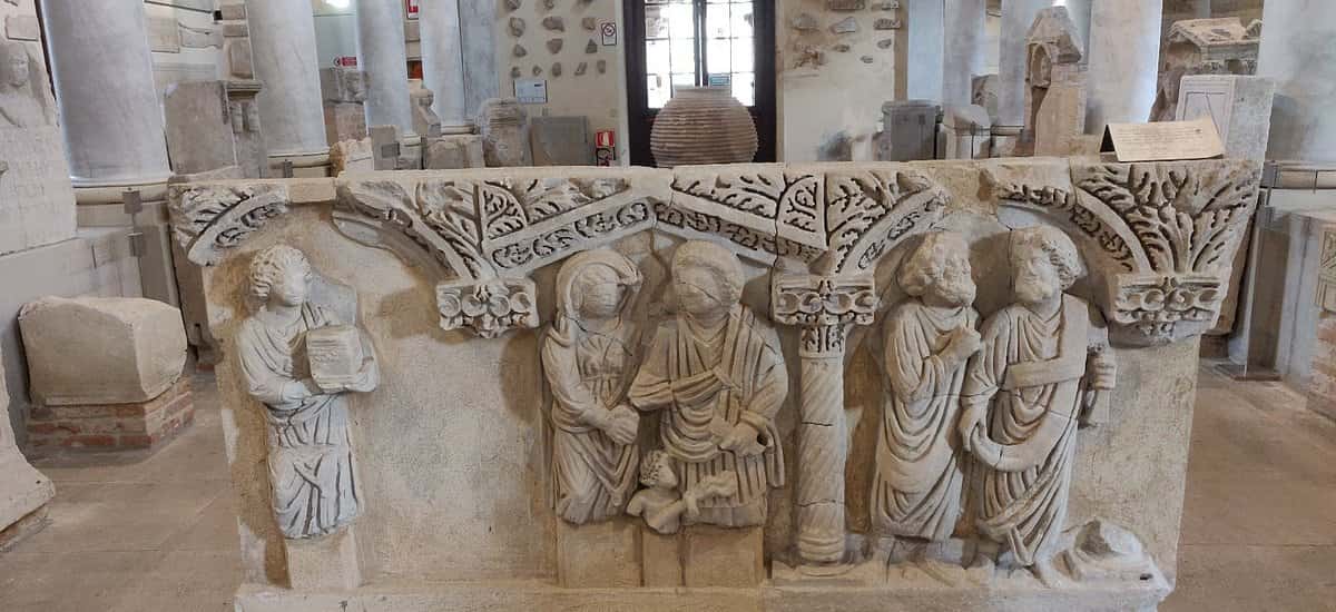 L’atrio contiene una scultura trecentesca con Madonna in trono con Bambino, ricavata da un frammento di un’iscrizione romana e un frammento di rilievo con tre littori in atto processionale. La grande aula contiene statue, mosaici, elementi architettonici, stele funerarie, ritratti e moltissimo materiale epigrafico, provenienti dalla città di Concordia e dai suoi monumenti. In una sala contigua, a destra dell’entrata, sono conservati ritratti in marmo, elementi decorativi da spazi pubblici e privati di Concordia e monete rinvenute nell’agro concordiese.